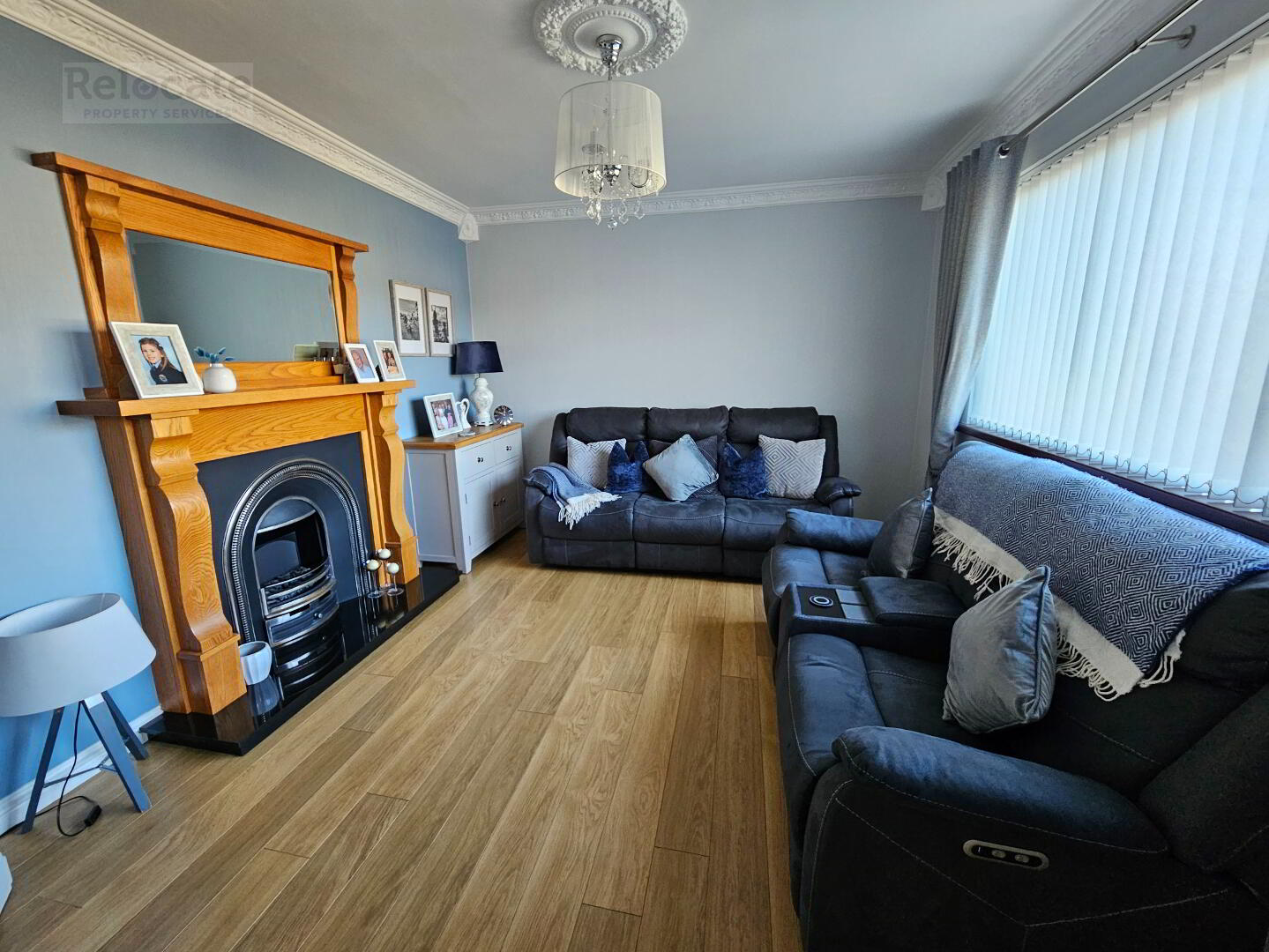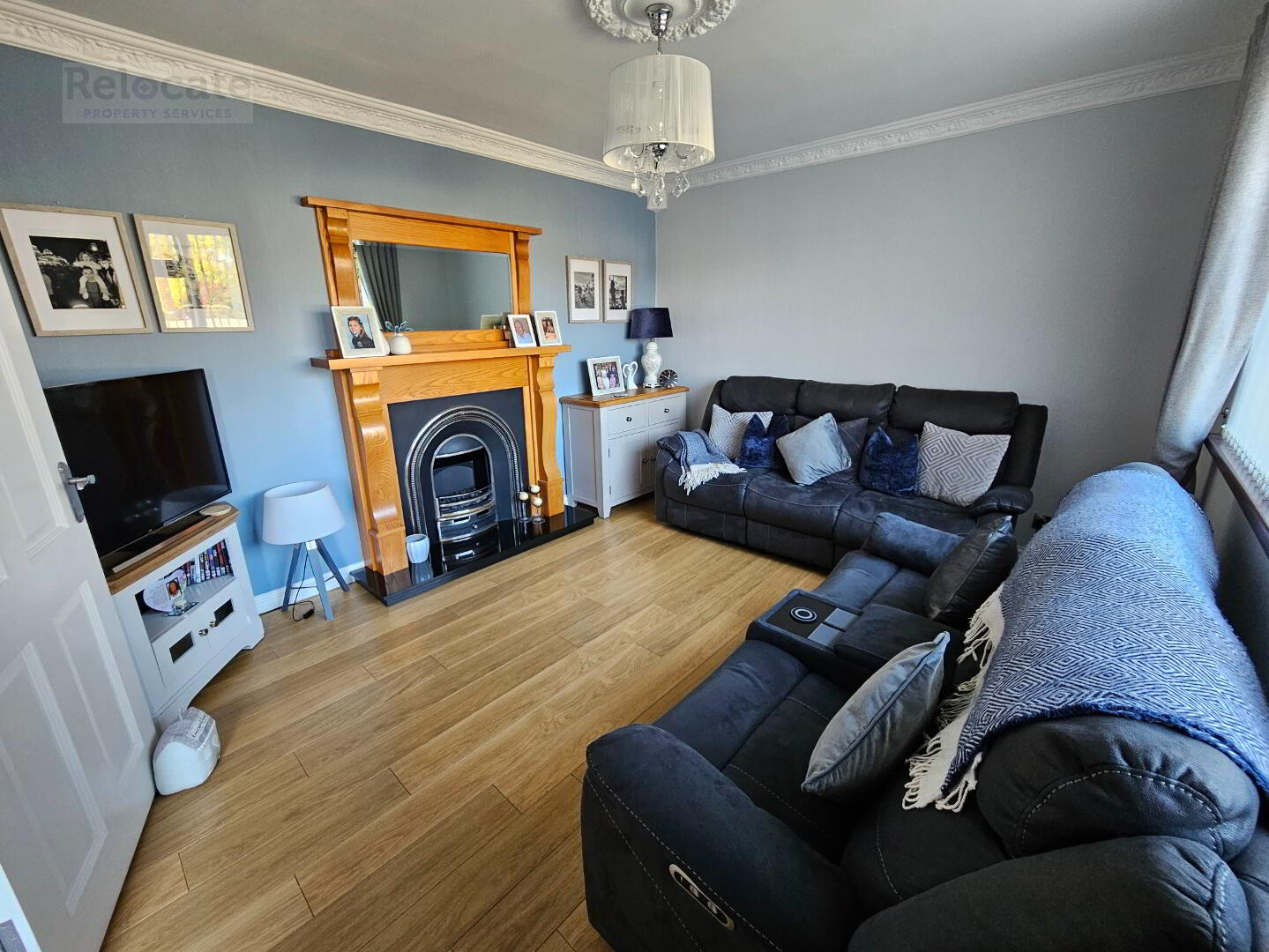 Laminate wooden floor underneath. Ceiling rose and coving. Front window. Electric fire with oak surround and granite hearth.