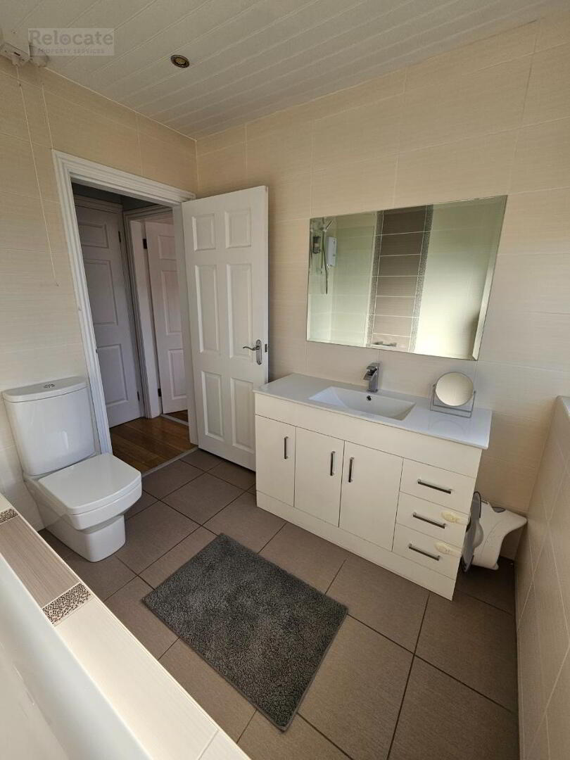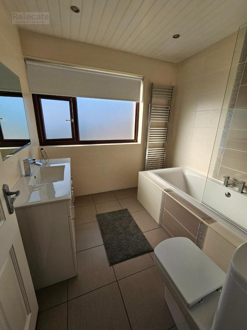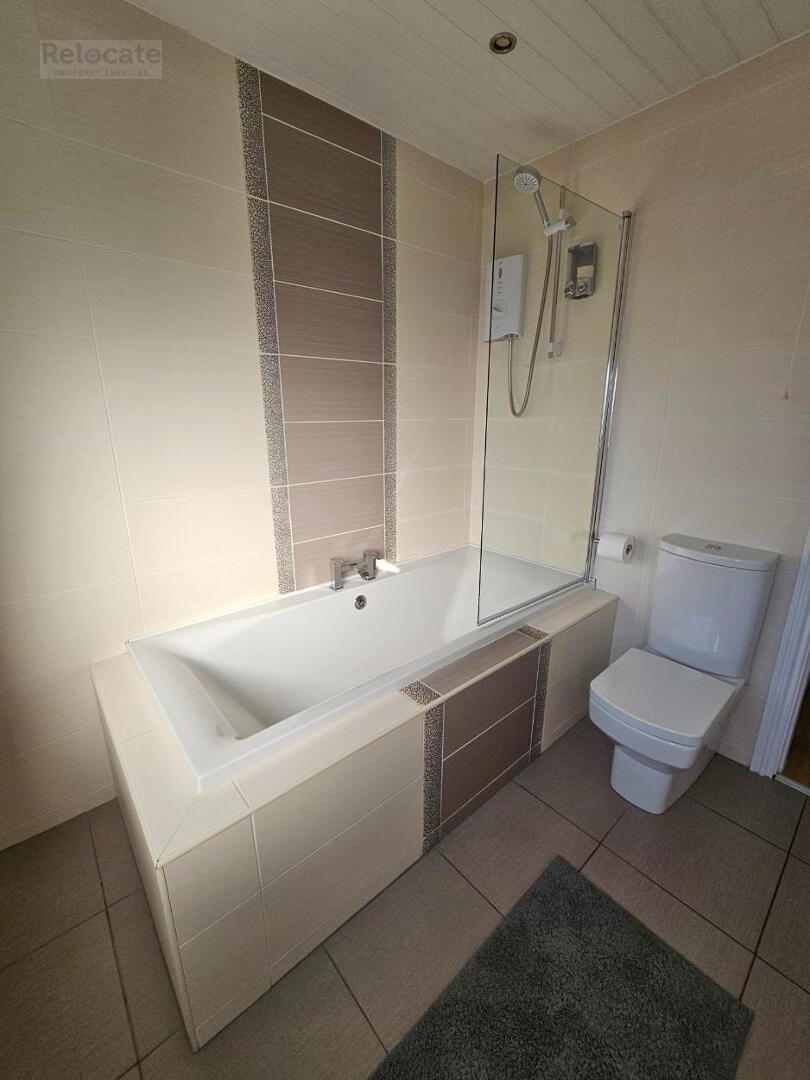 White suite comprising w.c and wash hand basin. Fitted bath with tiled surround. Electric 'Mira' shower fitted over bath with shower panel. Fully tiled walls. Tiled floor. Spot lighting. Large privacy glazed rear window.