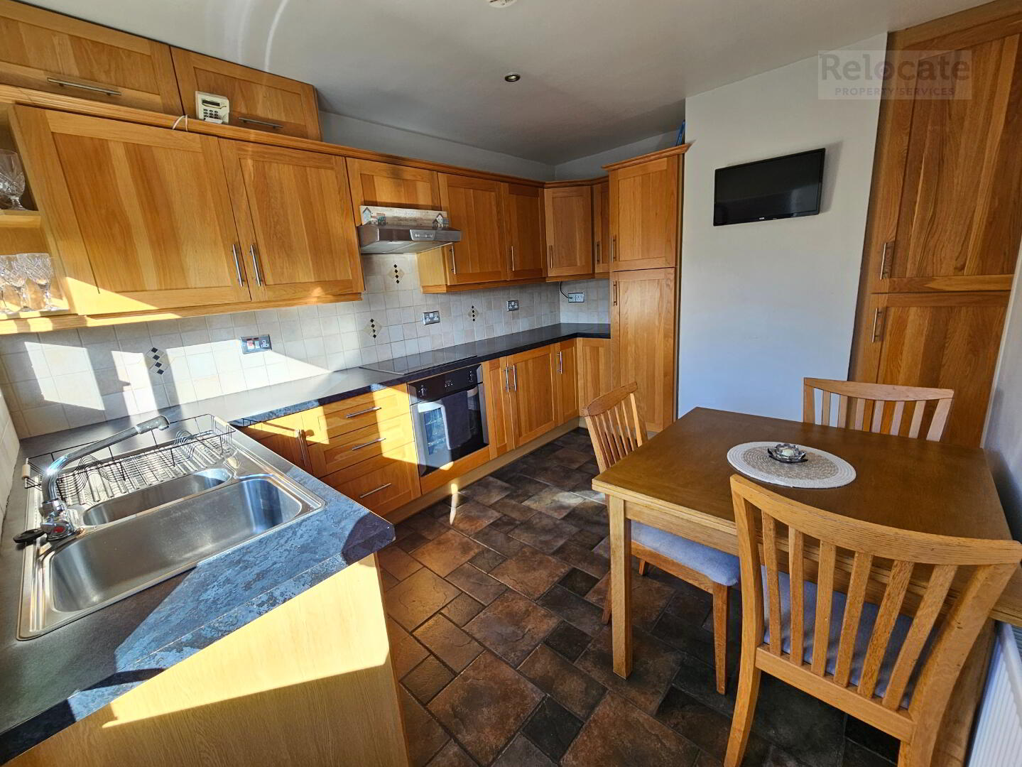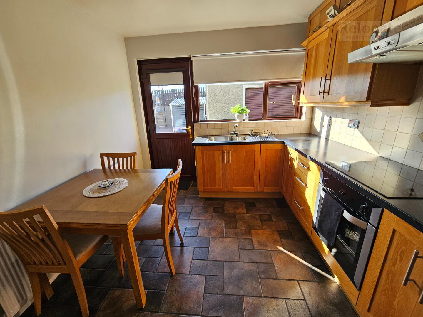 Oak fitted kitchen with high and low level units. Stainless steel sink and drainer. Tiled at splash back. 'Belling' electric oven and hob with extractor fan over. Integrated Fridge. Tiled floor. Window to rear. Glazed PVC external door.