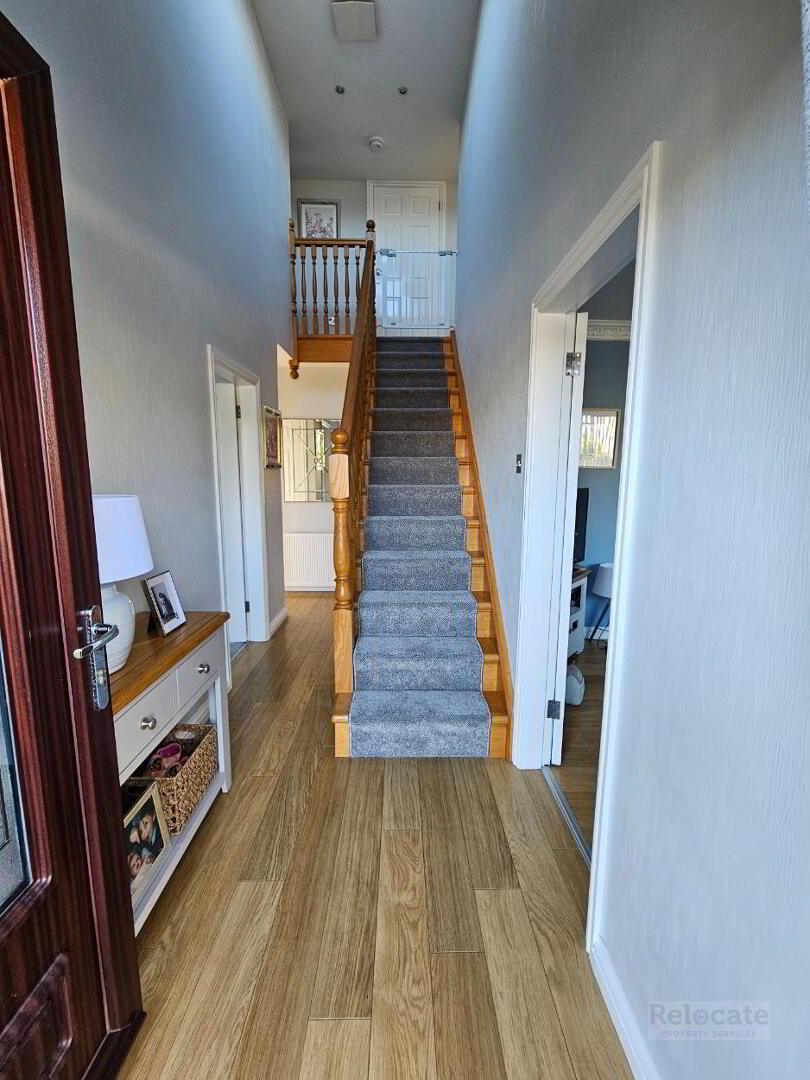 Through mahogany PVC front door with side panels. Laminate wooden floor. Oak Staircase.