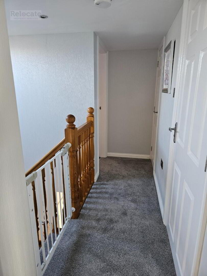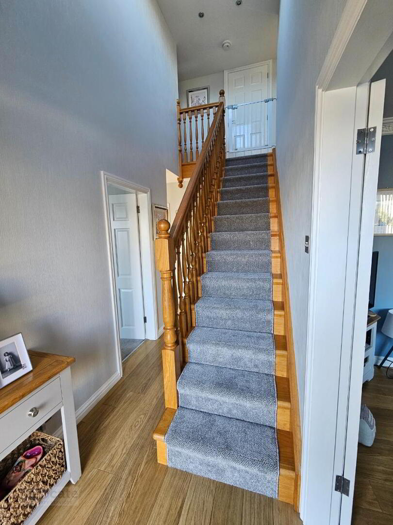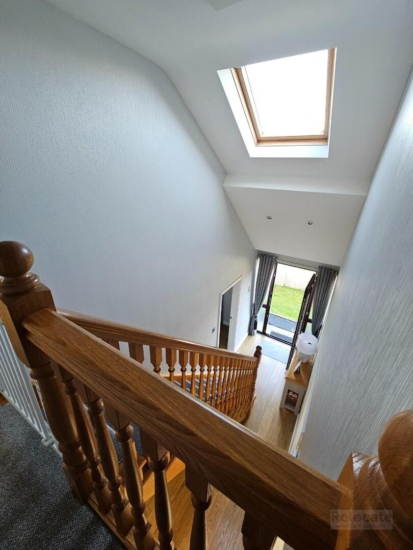 Oak stairs to first floor fitted with carpet runner. Carpet on floor landing. Spot lighting. Roof light on stairs ceiling.