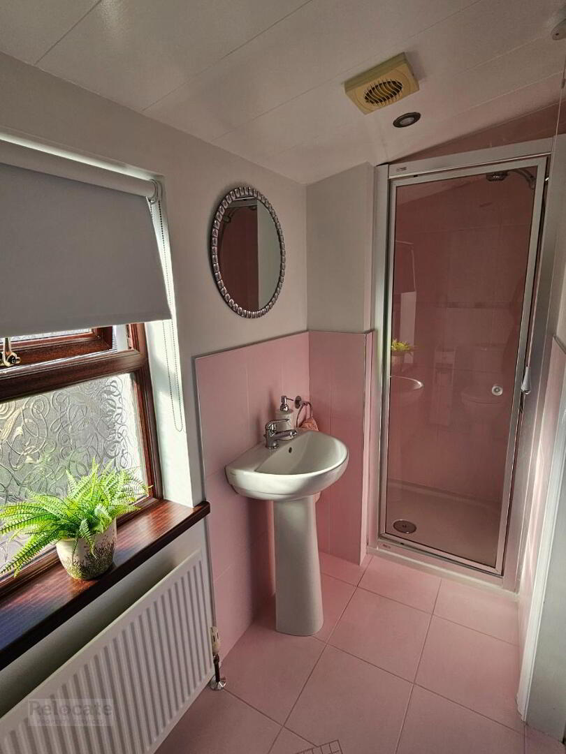 White suite comprising WC, wash hand basin and shower fitted with power shower. Extractor fan. Tiled floor. Part tiled walls. Privacy window to rear.