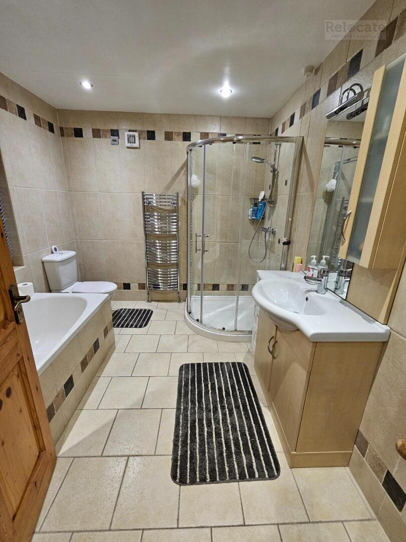 Fully tiled with white comprising wash hand basin, w.c, shower cubicle with thermostatic power shower. Two heated towel rails. Spot lighting. Extractor fan. Privacy window to the rear.