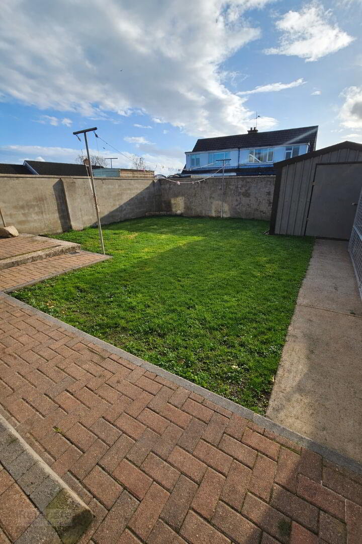 Wall fully enclosing the rear garden. Lawn and patio area with brick paving. Foundation in for a sunroom off the dining room. Metal shed with electric supply. To the front there is a brick paved drive with off street parking