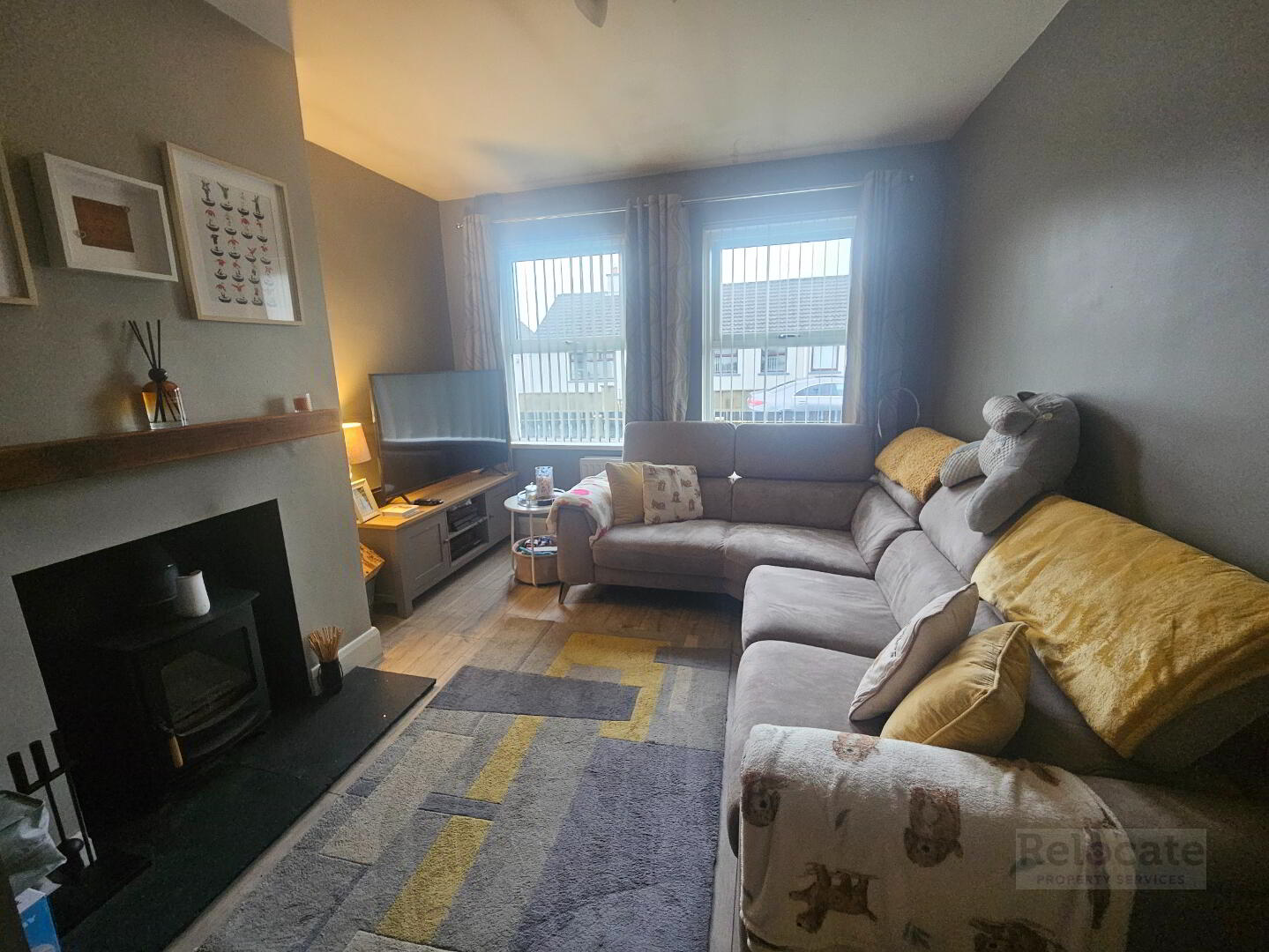 Wood burning stove with slate hearth and wooden mantle. Laminated wooden floor. Two windows to the front.
