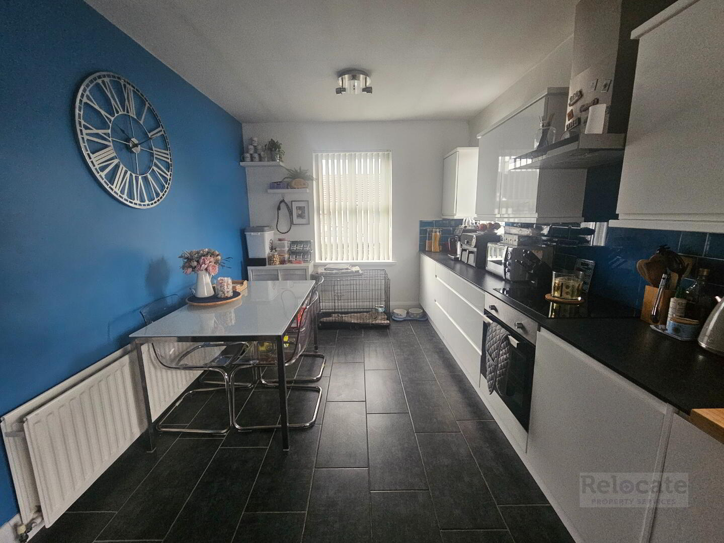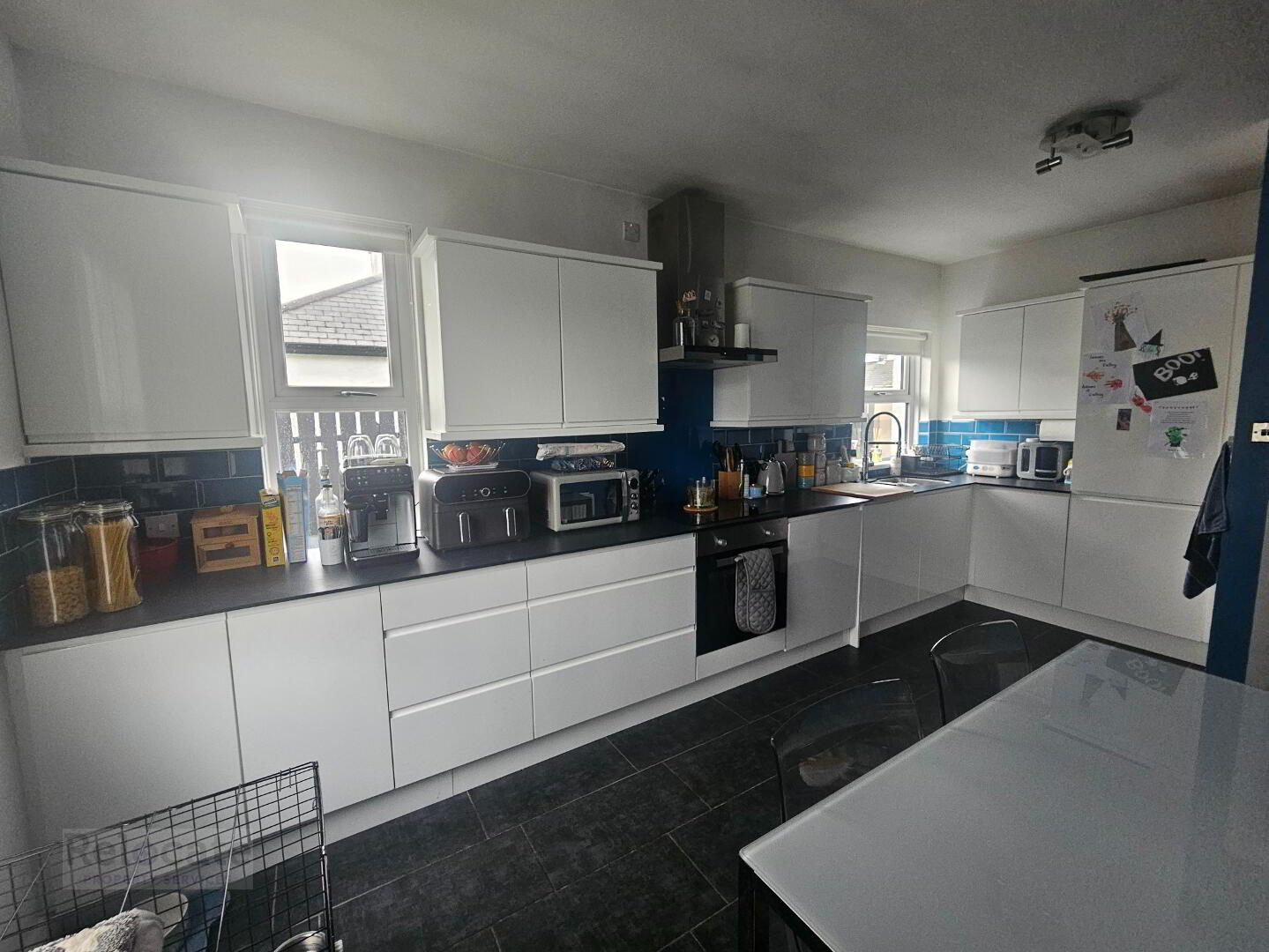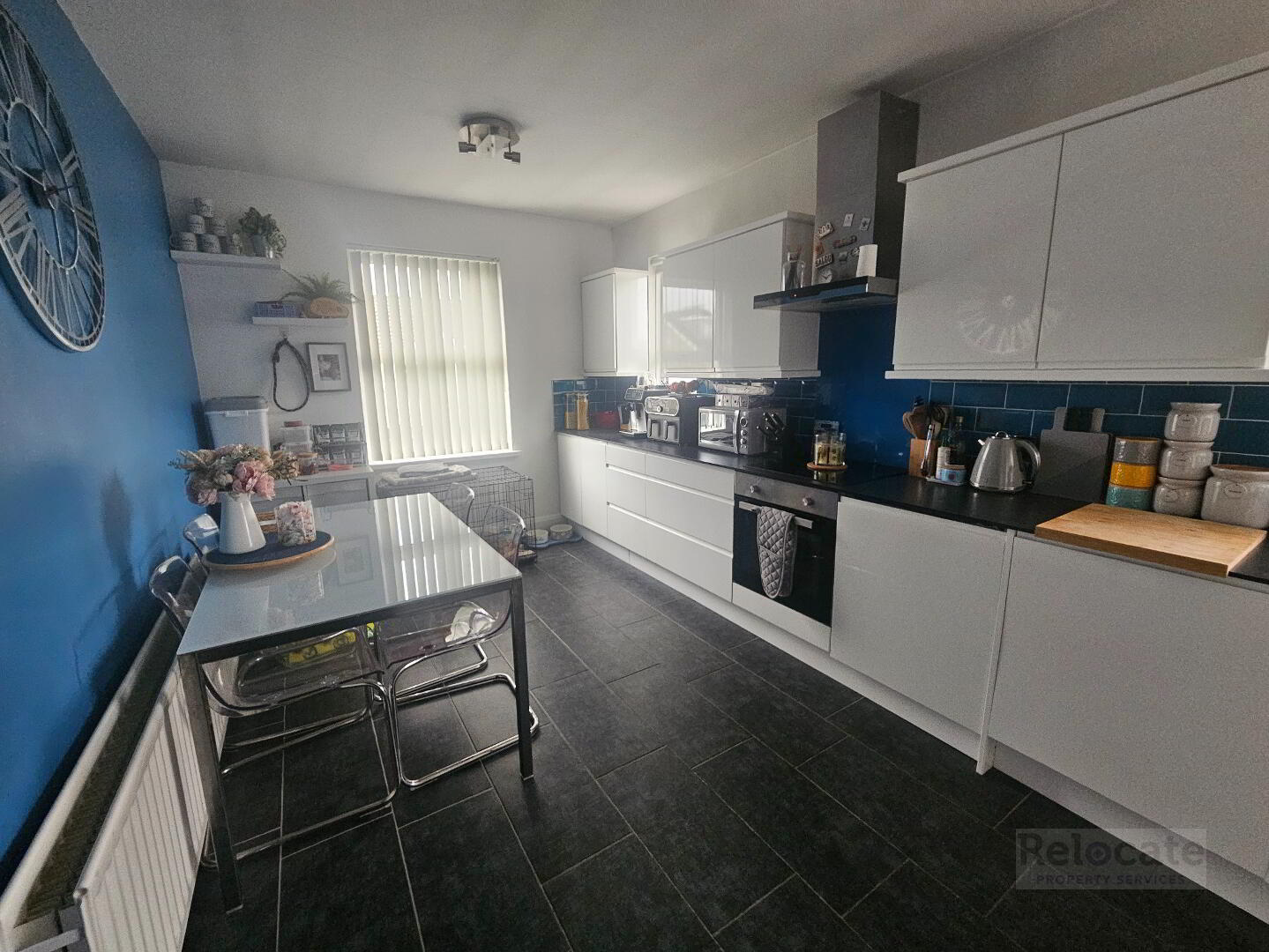 Modern high gloss kitchen with good range of high and low level units. Integrated oven and electric hob with stainless steel extractor fan over. Integrated dishwasher, washing machine and fridge freezer. Stainless steel sink and drainer. Tiled splashback. Window to the side and window to the front.