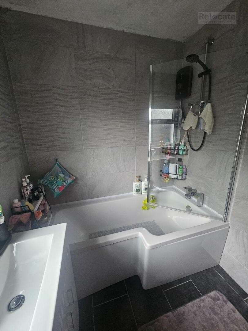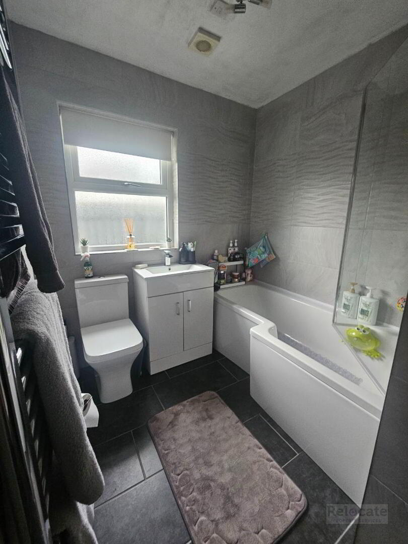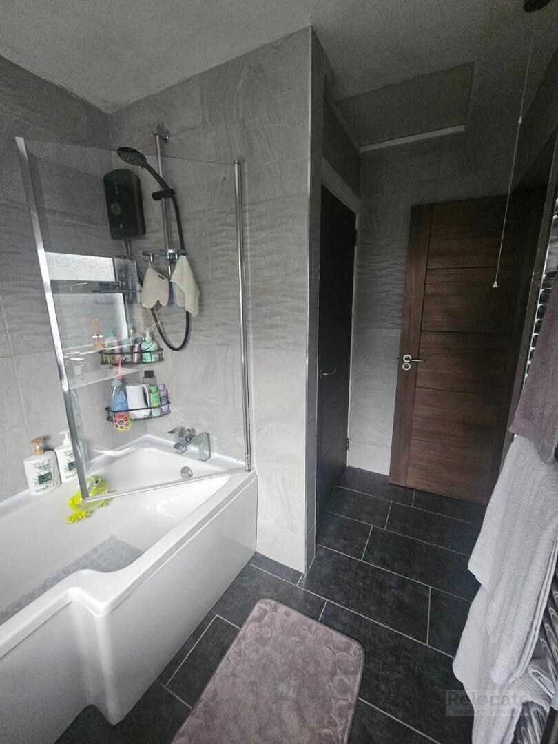 White suite comprising w.c, wash hand basin and bath with electric shower over. Fully tiled walls and floor. Heated towel rail. Privacy window to the side.