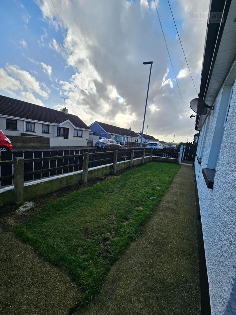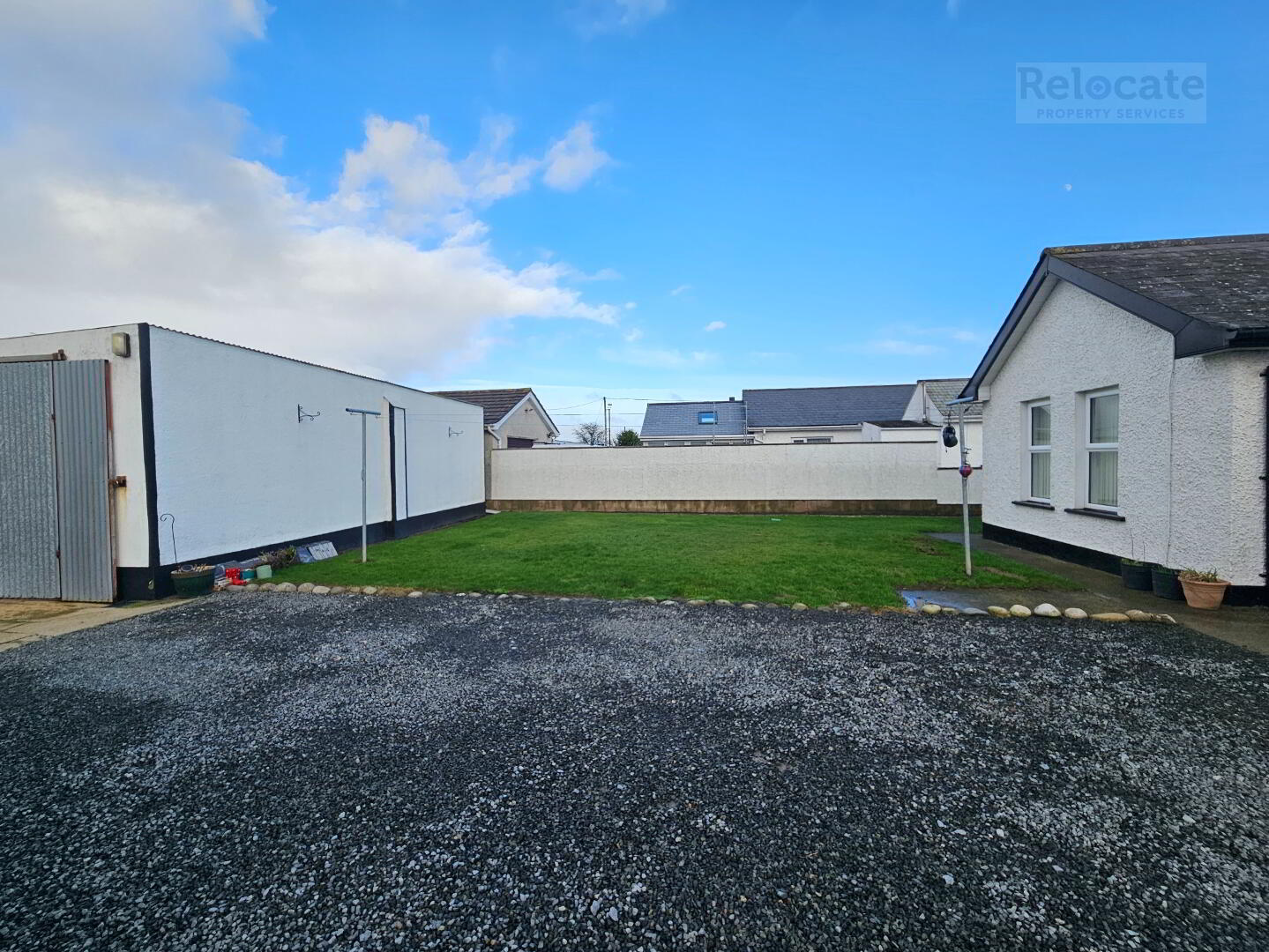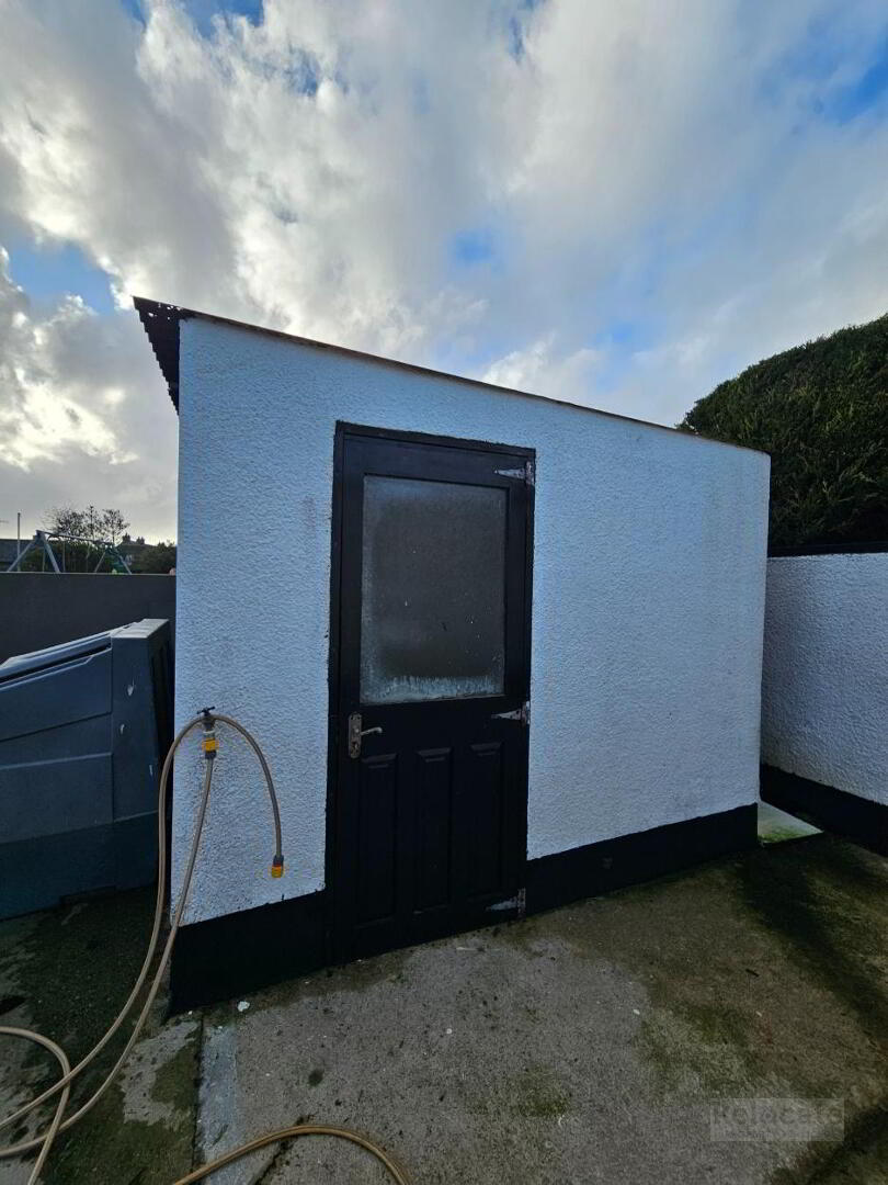 Front and side garden, gate and path to the front door. Large shed to the rear with sliding door and concrete yard. Smaller shed with wooden glazed door and side window.