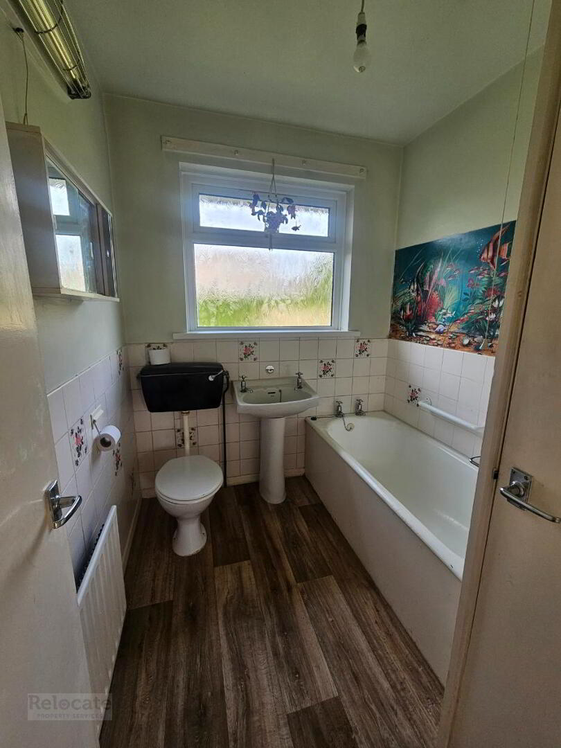 WC, wash hand basin and bath. Part tiled walls. Vinyl flooring. Privacy window to rear.