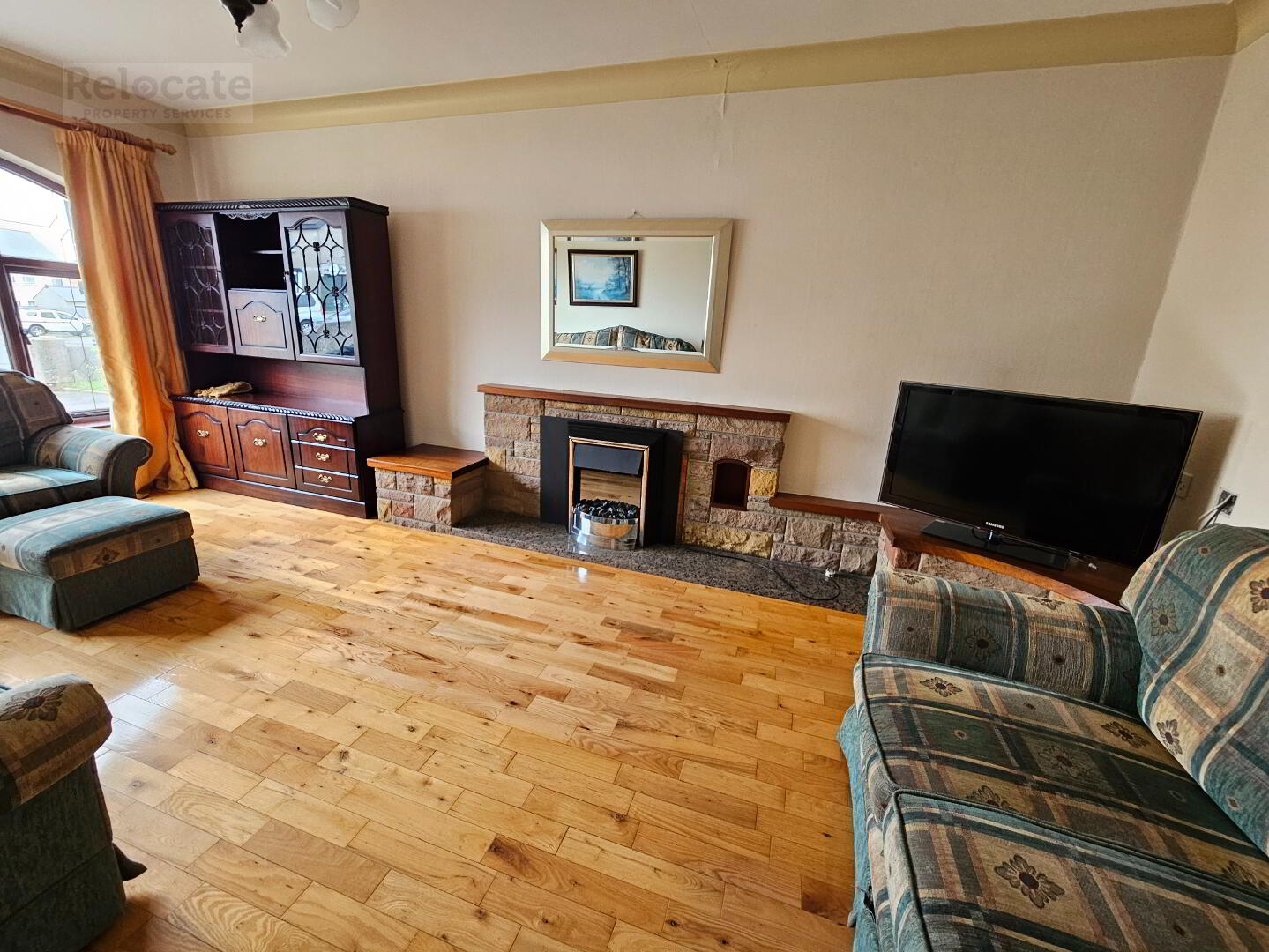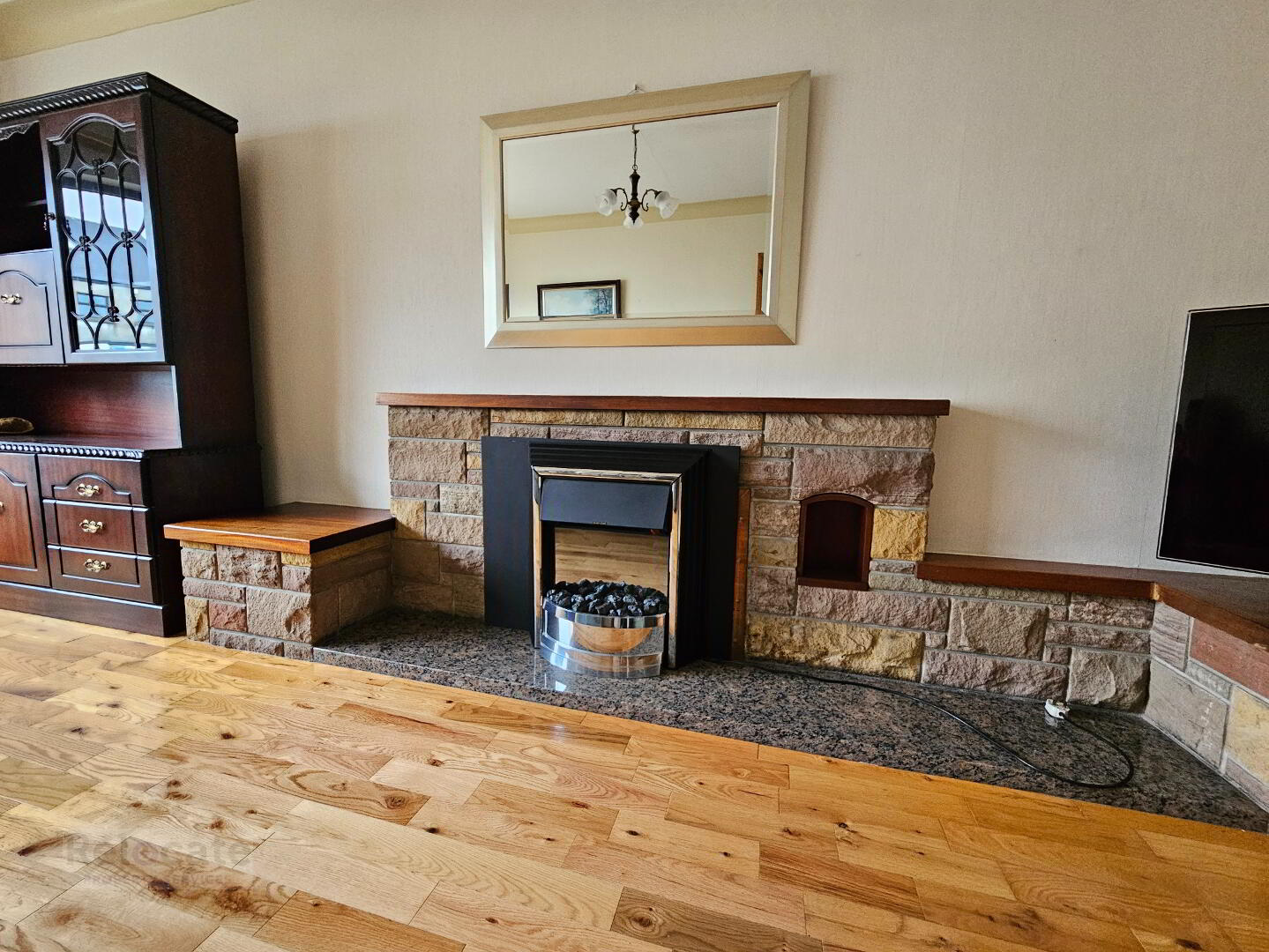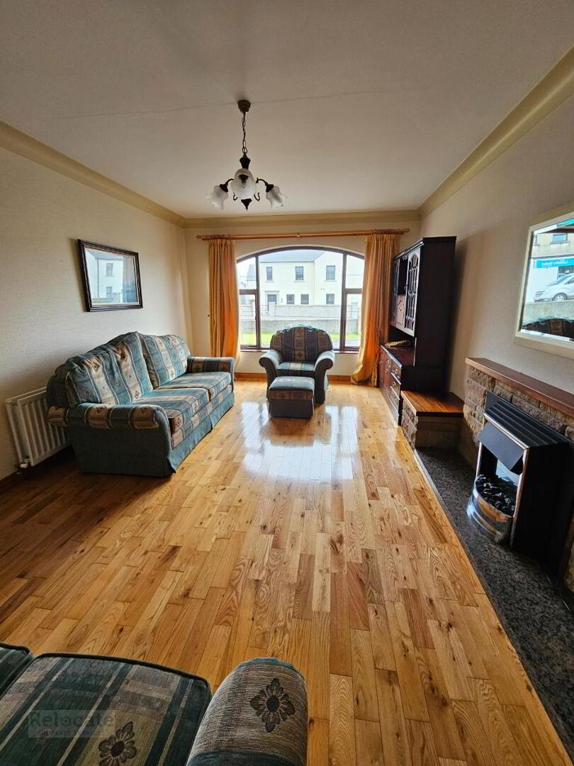 Stone fireplace with open fire and back boiler. Granite hearth and wooden mantle. Solid wood floor. Large feature arched window to the front. Ceiling coving.