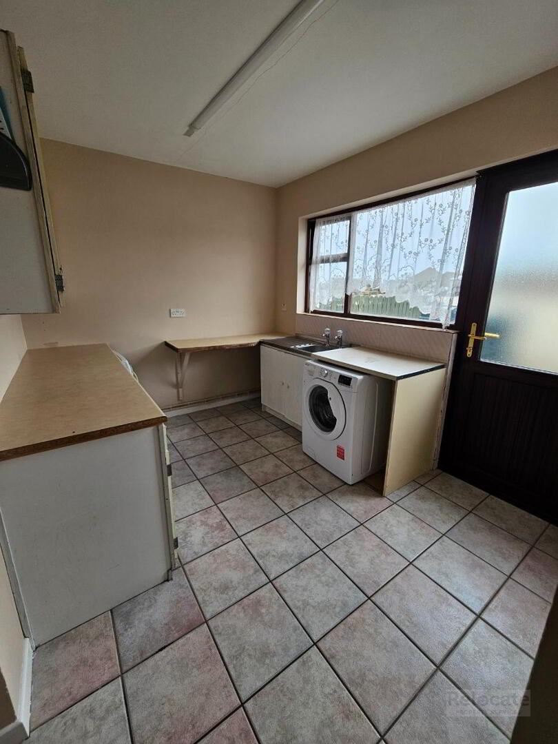 High and low level units. Stainless steel sink and drainer. Recess for washing machine. Tiled floor. Window and pvc door to rear.