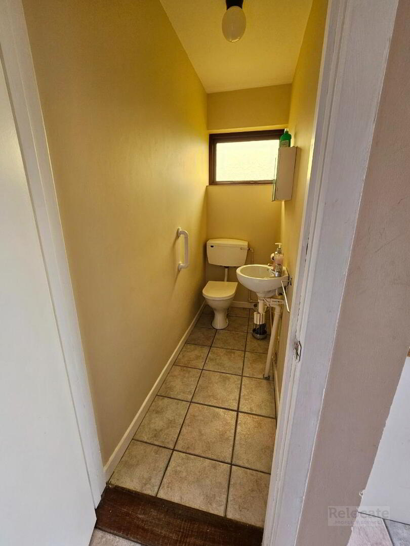 Suite comprising w.c and wash hand basin. Privacy window to rear. Tiled floor.
