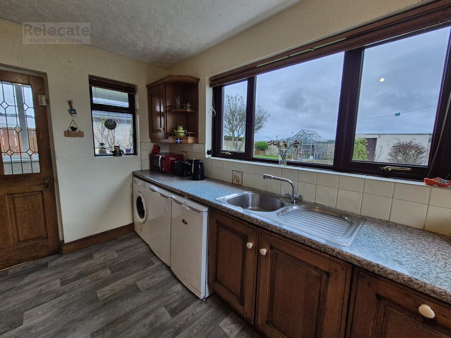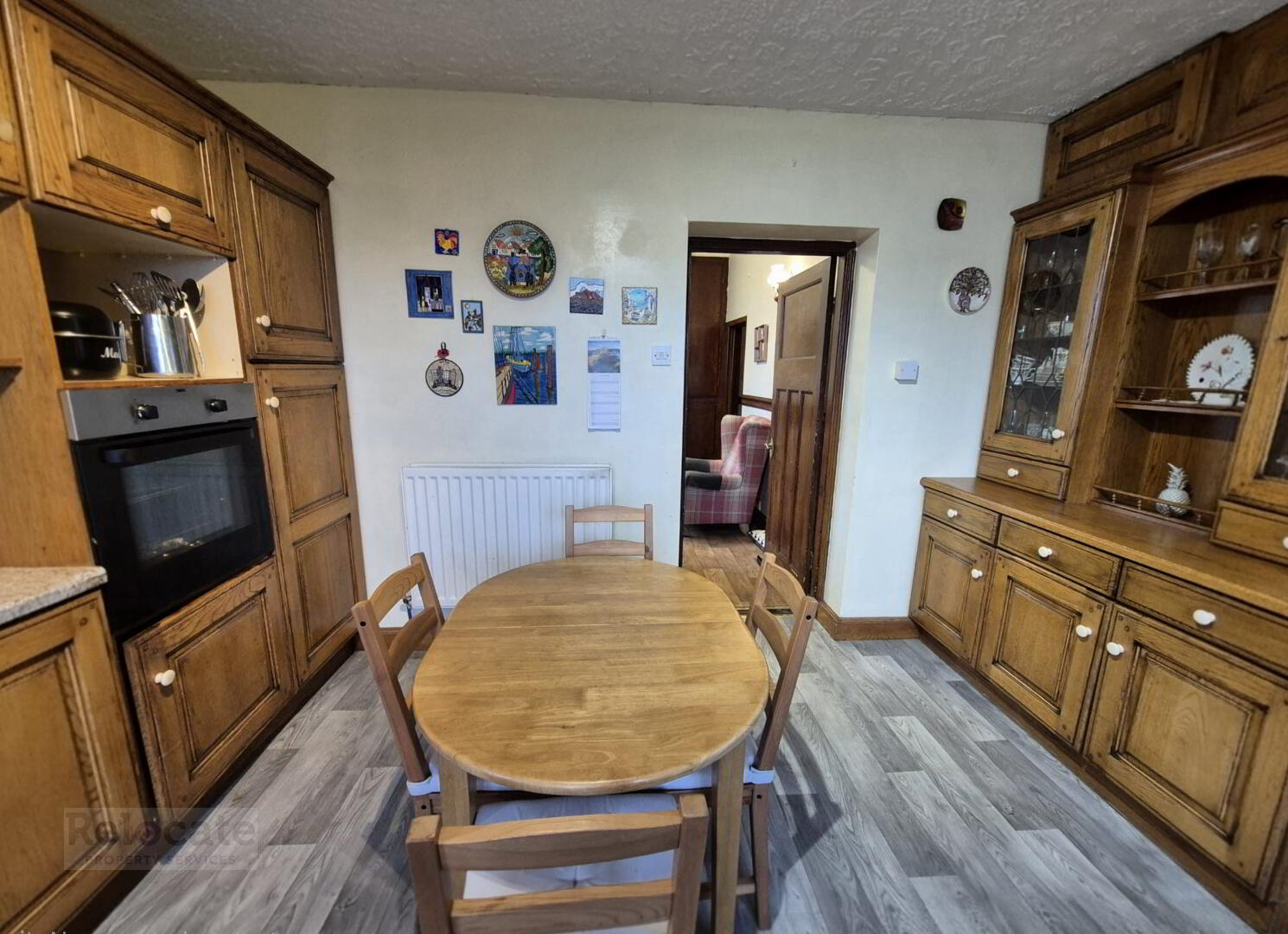 Solid kitchen with good range of high and low level units. Matching dresser with display cabinets and lighting. Stainless steel sink & drainer. Tiled splashback. Electric 4 ring hob. Integrated electric oven. Wood effect vinyl flooring. Undercounter area for fridge/freezer. Plumbed for washing machine. Double radiator. Window to either side. Rear aspect window overlooking garden. Solid oak glazed door through to back porch.