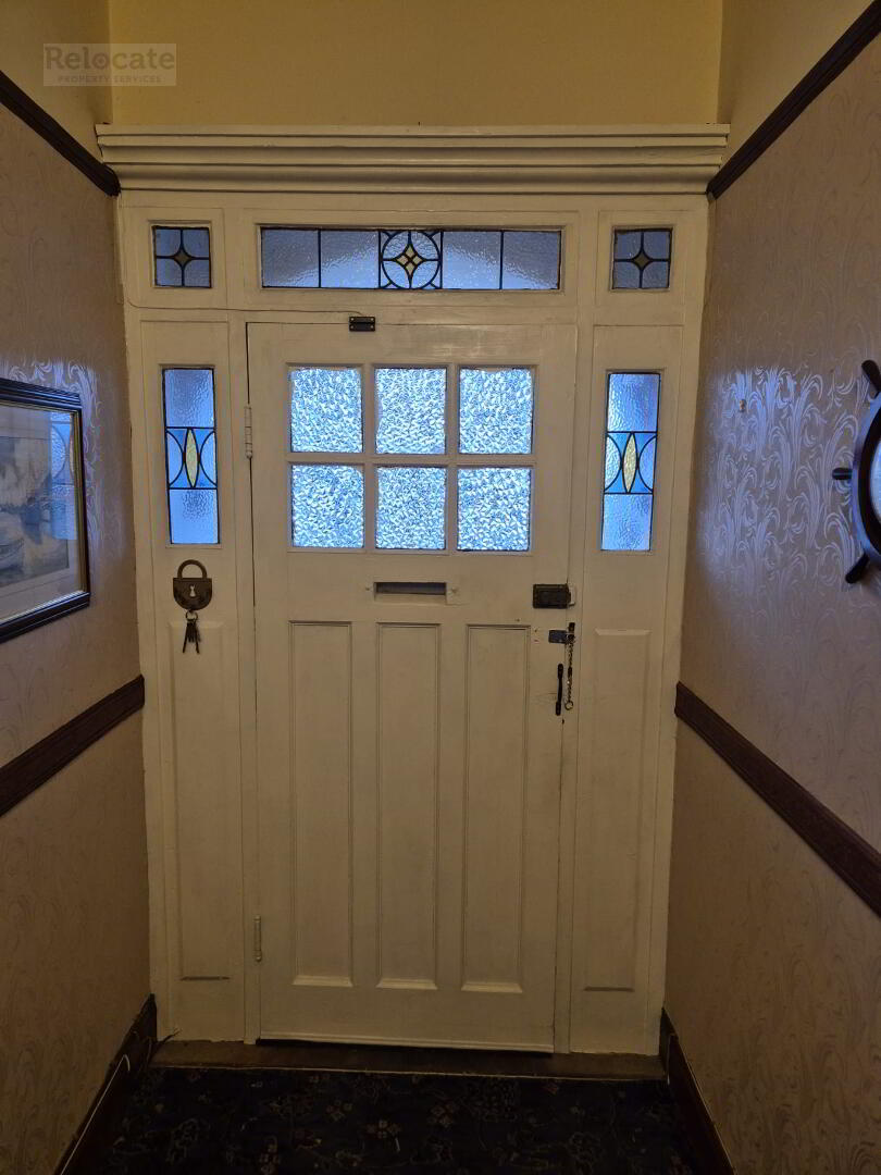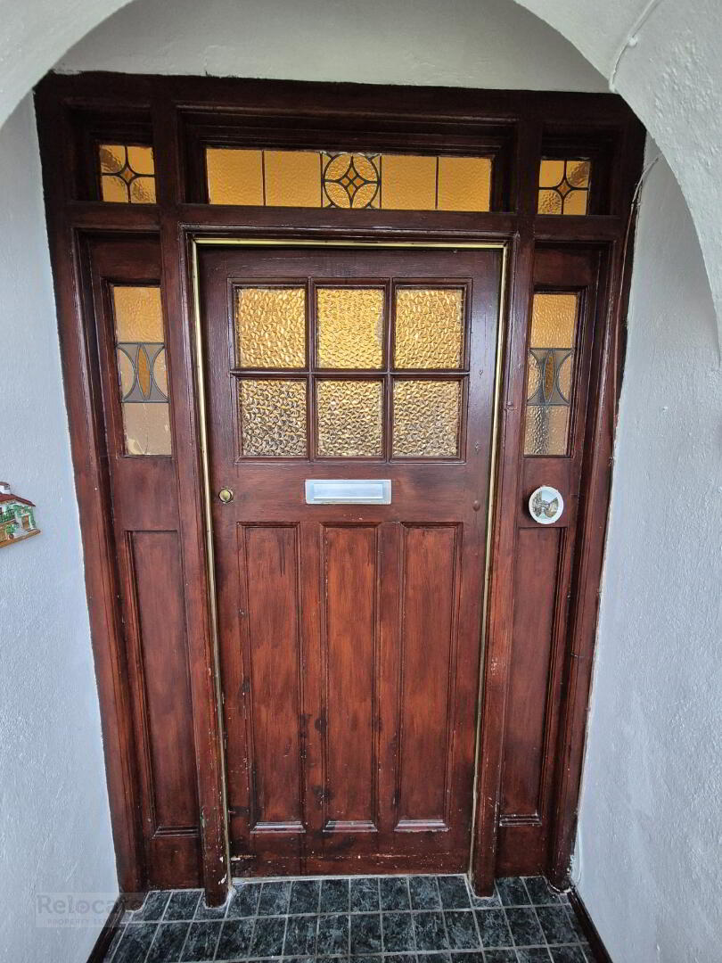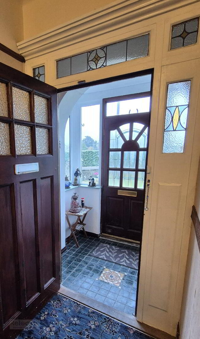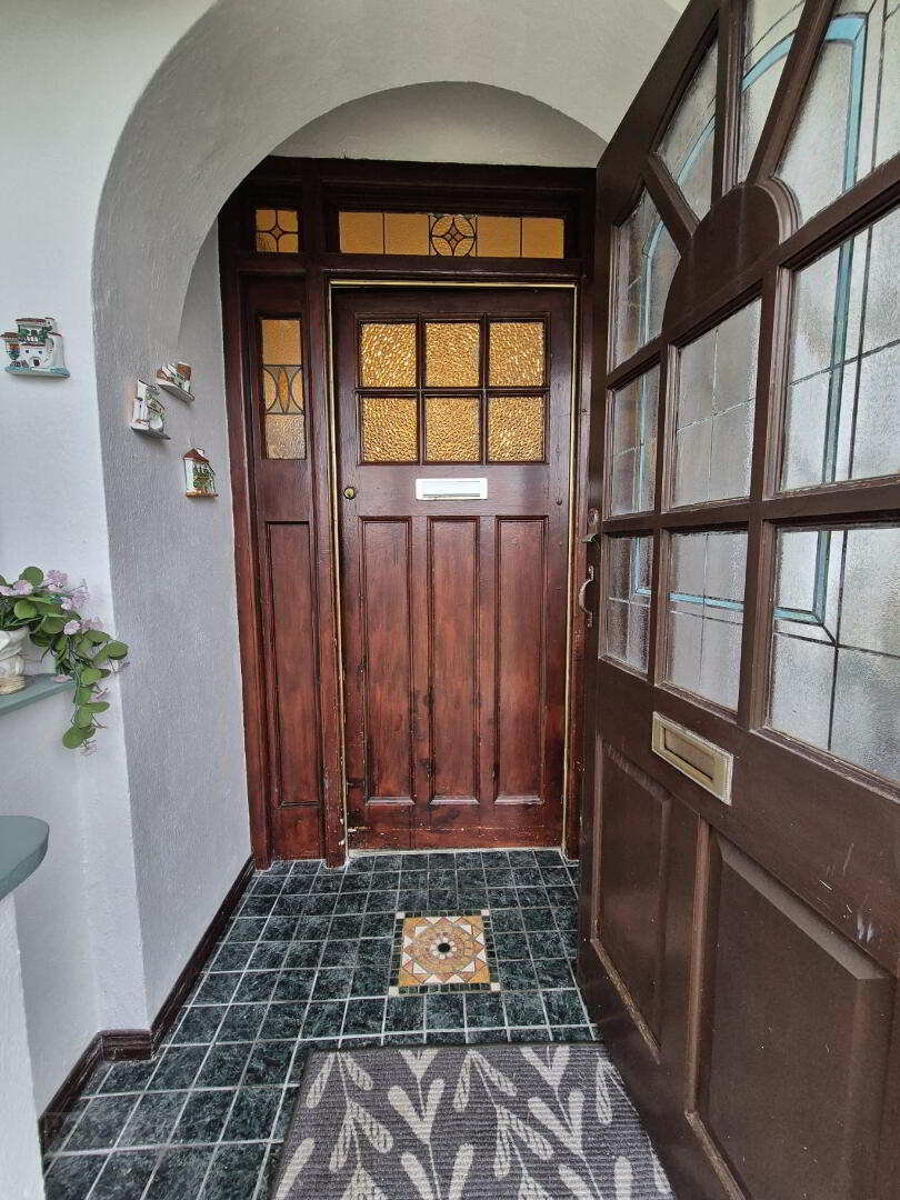 Hard wood front door with stained glass and glazed side panels. Tiled floor. Arch ceiling and hard wood inner door with stained glass surround.
