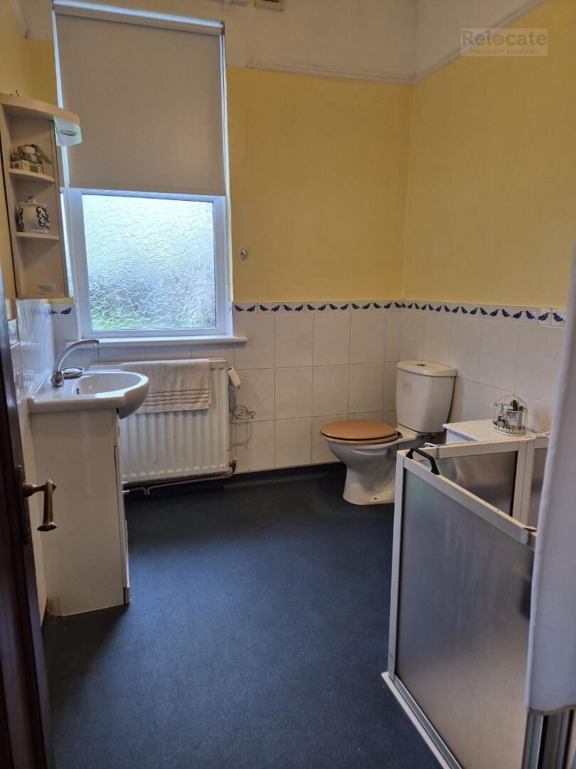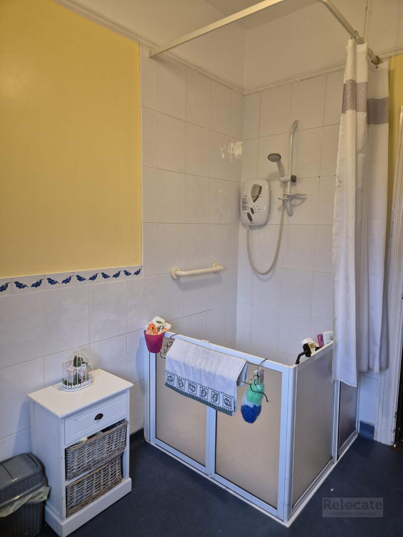 Vinyl flooring. Part tiled walls. Tiled at shower area. White WC and wash hand basin with vanity unit. Electric shower. Double radiator. Long privacy glazed window with roller blind.