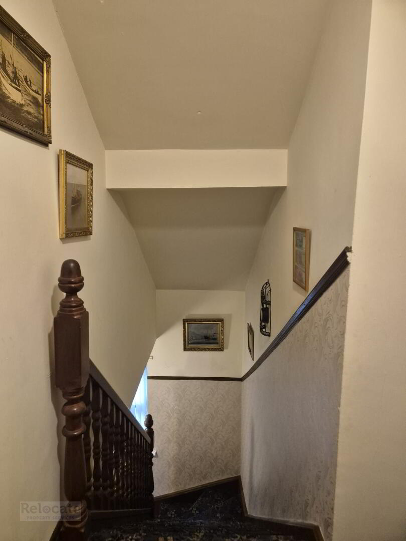 Carpeted stairs with solid wood balustrade. Under stairs storage cupboard. Window on stairs. Picture rail.