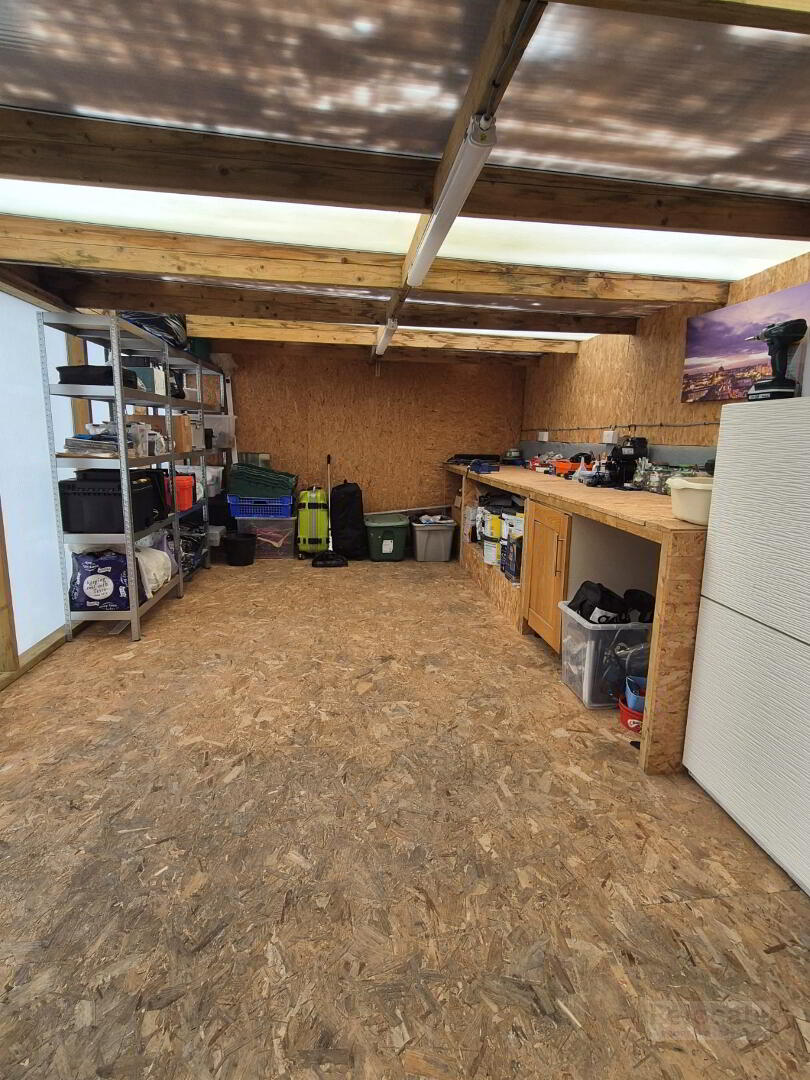 Wood effect vinyl floor. PVC tongue and groove ceiling panels. Spotlights. 6 double power points. Privacy glazed window and PVC door.