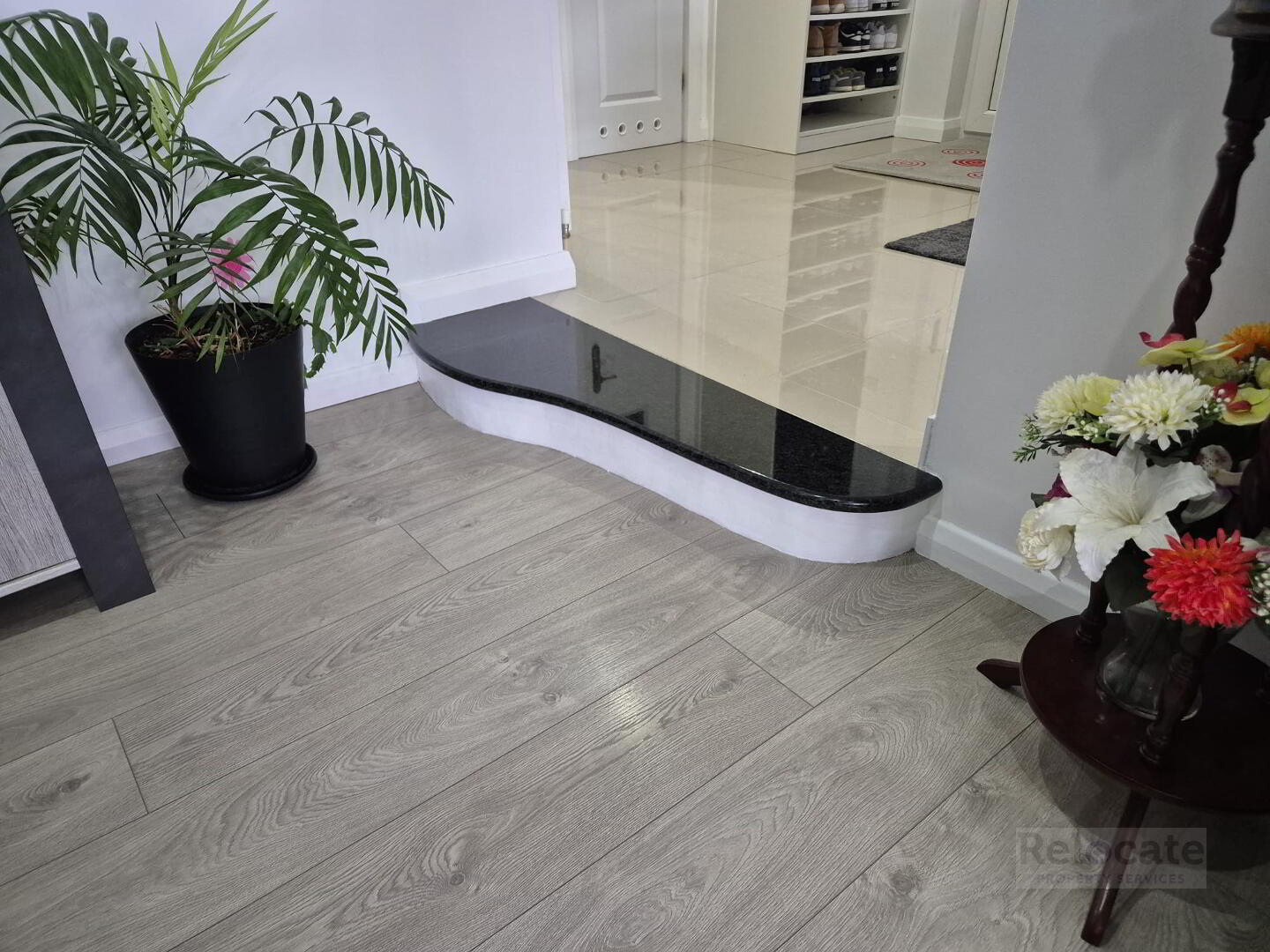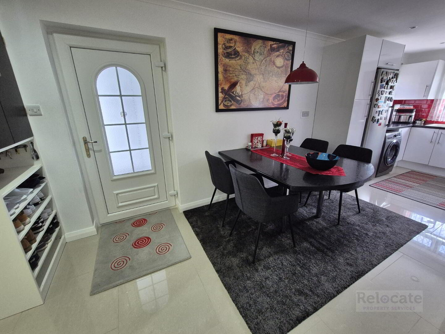 Through PVC door with side glazed panel. Privacy glazed side window to front. Grey venetian plastered walls. Vinyl flooring. Built in storage cupboards and shelving. Double power point. Rear PVC French doors leading to back garden & driveway. PVC door through to kitchen.