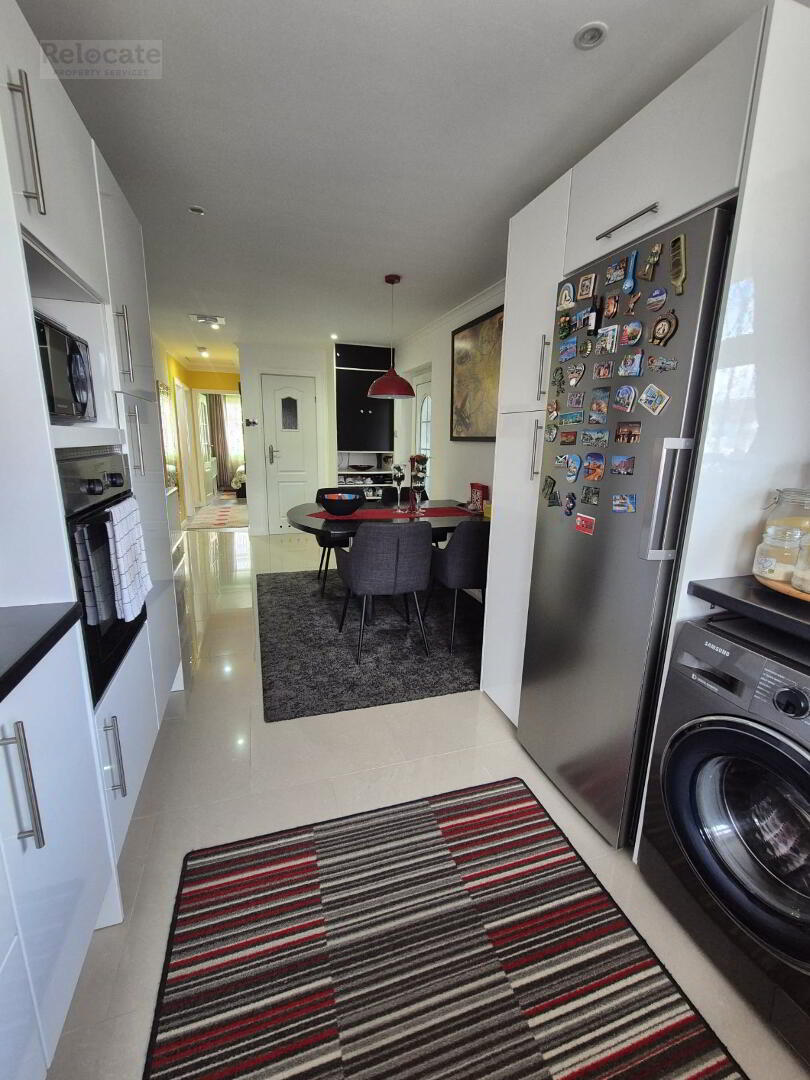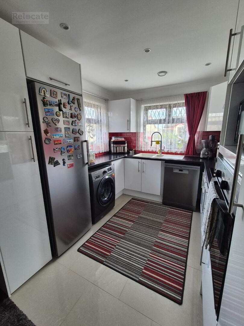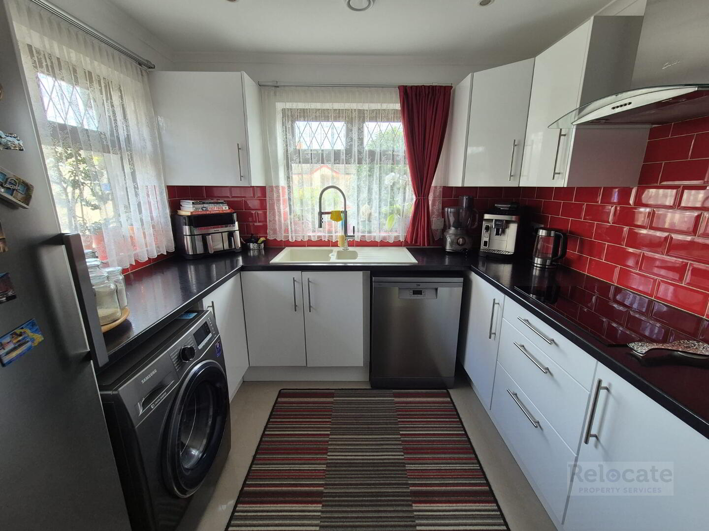 Modern fitted white high gloss kitchen with high- and low-level units. Black laminate worktops. Recess for Fridge/Freezer and microwave. Plumbed for dishwasher and washing machine. Acrylic sink and drainer with chrome hose tap. Window to front and side. 6 power points. 4 ring electric hob with stainless steel extractor fan. Integrated electric oven. Spotlights. Granite window cills. 2 radiators.