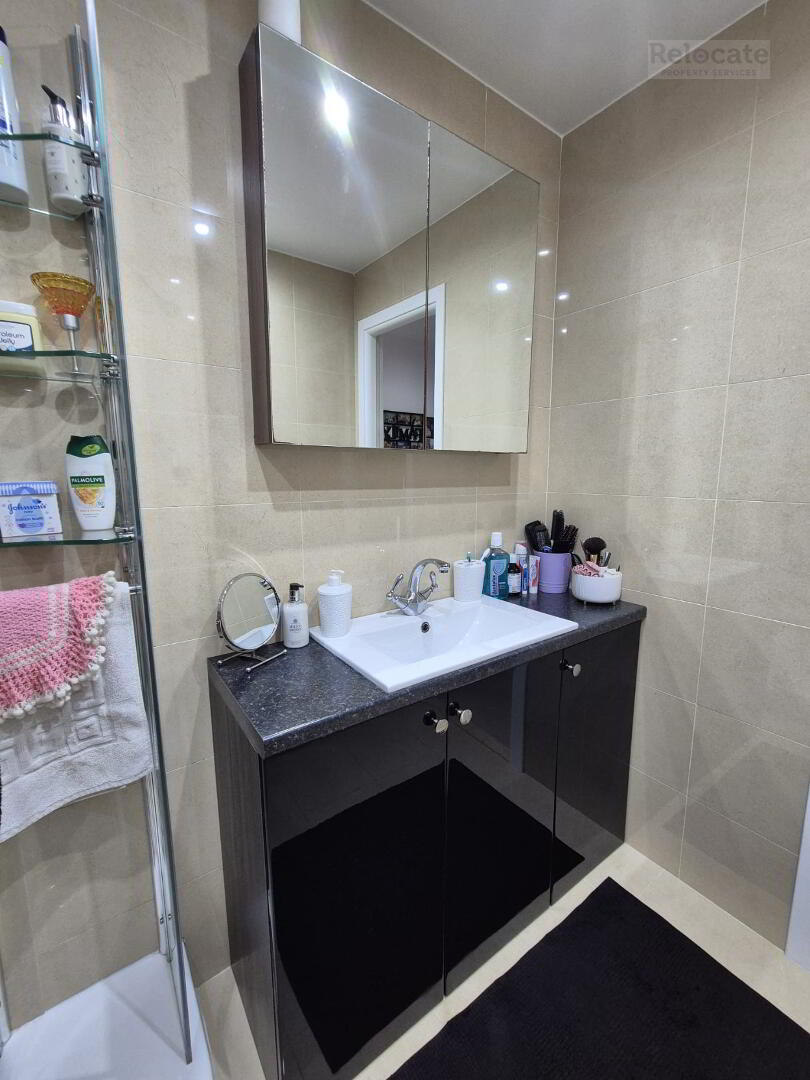 Fully tiled. Shower fitted with both electric and thermostatic shower. Built in vanity unit with wash hand basin and mirrored wall unit. Chrome fittings. Radiator.
