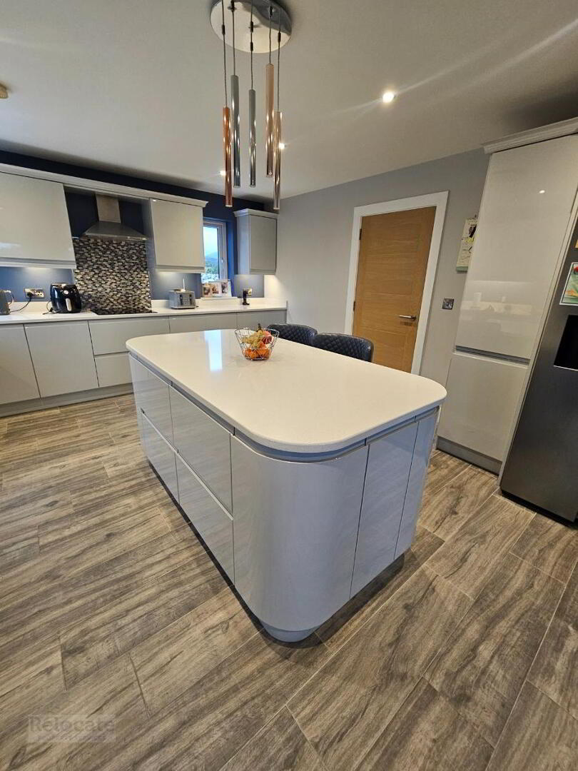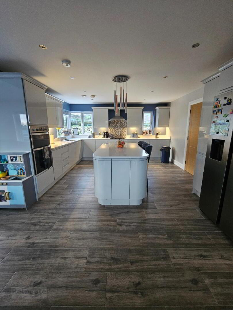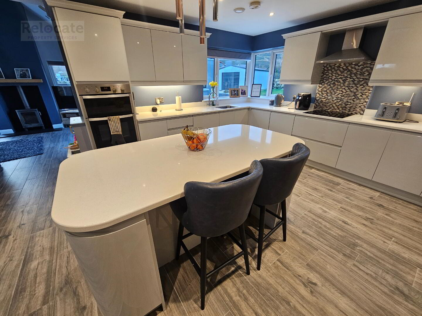 High gloss kitchen with quartz worktop. Island with curved cupboards and seating area. Stainless steel sink. Integrated electric oven and hob. Integrated dishwasher. Recess for American fridge freezer. Stainless steel extractor fan. Tiled at hob splashback. Tiled floor. Corner window to rear garden with beautiful mountain views. Windows to the front. Spot lighting. Centre light above island. Glazed door to hall. Door to rear porch.