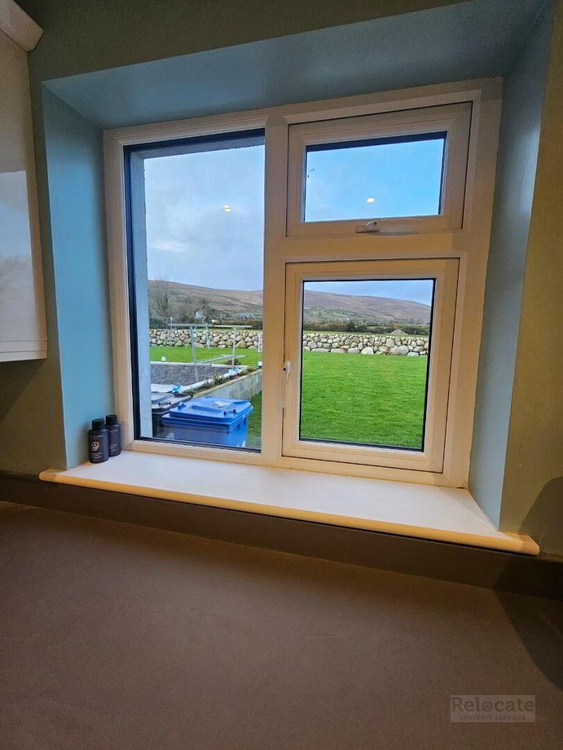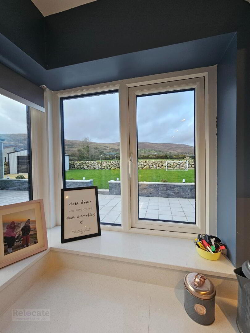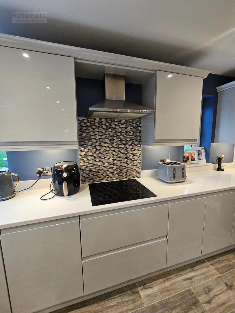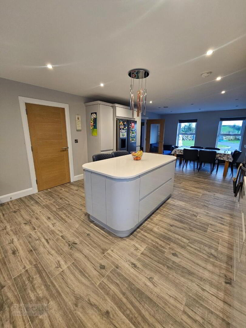 High gloss kitchen with quartz worktop. Island with curved cupboards and seating area. Stainless steel sink. Integrated electric oven and hob. Integrated dishwasher. Recess for American fridge freezer. Stainless steel extractor fan. Tiled at hob splashback. Tiled floor. Corner window to rear garden with beautiful mountain views. Windows to the front. Spot lighting. Centre light above island. Glazed door to hall. Door to rear porch.