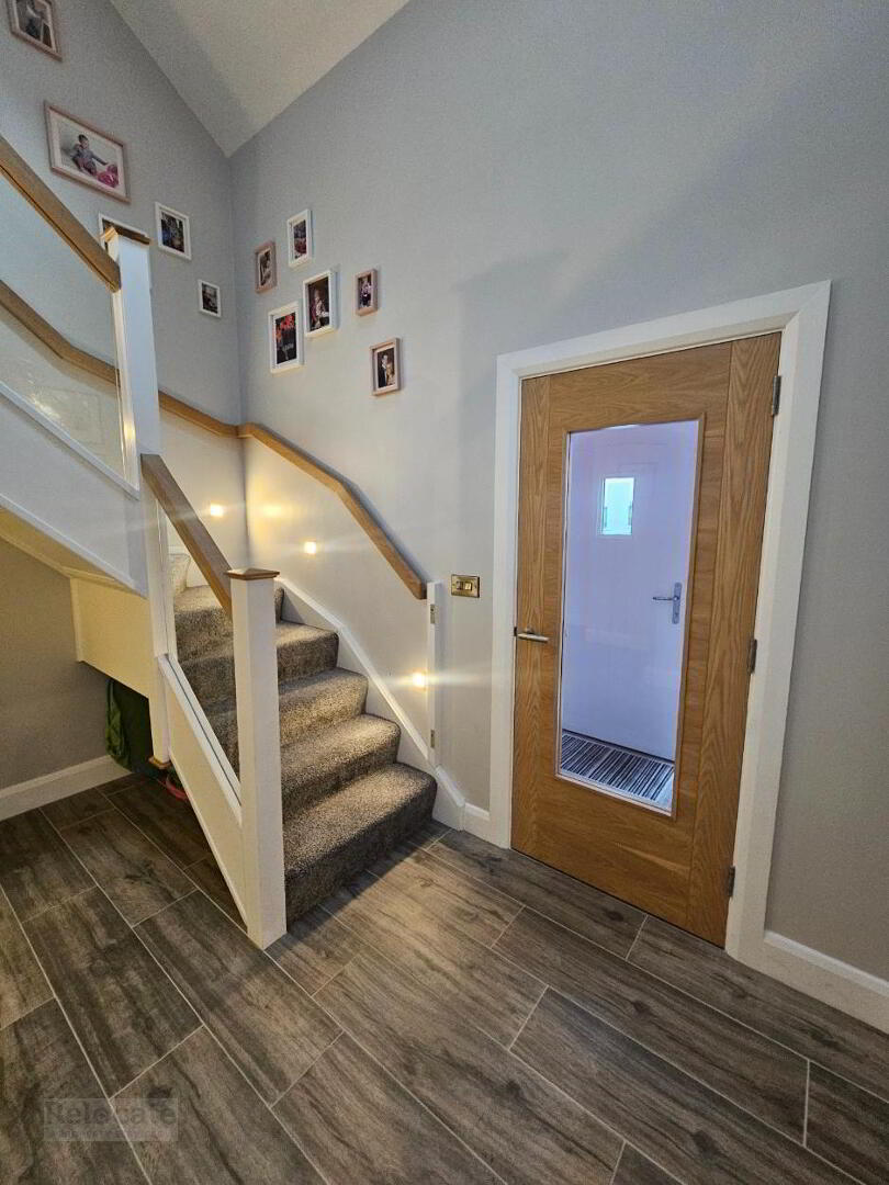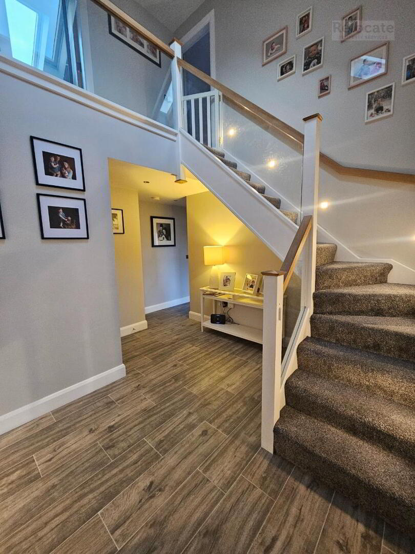 With tiled floor, oak and glass staircase with carpet to first floor. Spot lighting. Stair lighting.