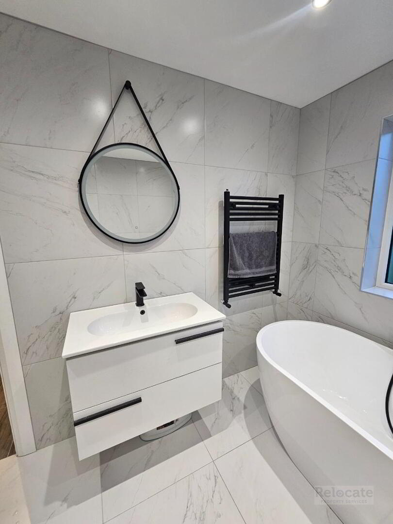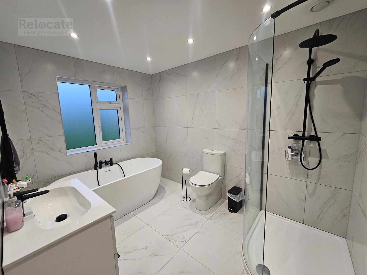 Fully tiled bathroom with white suite. Comprising w.c, wash hand basin with drawers under. Freestanding bath. Shower with power shower. Heated towel rail. Privacy window to the rear. Spot lighting.