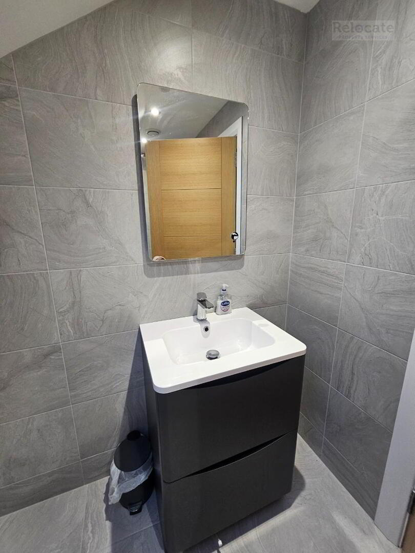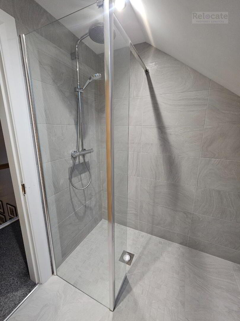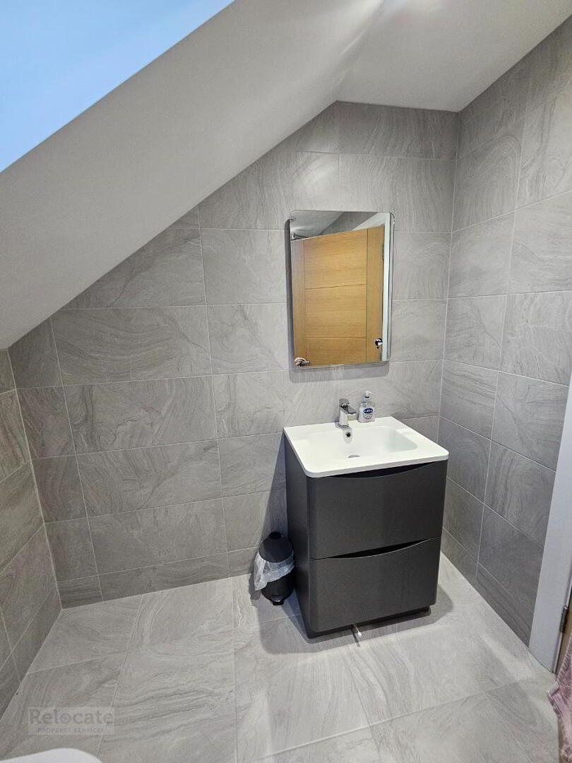 Fully tiled. White suite comprising w.c, wash hand basin with drawers under. Power shower with rain head shower and screen. Velux window.