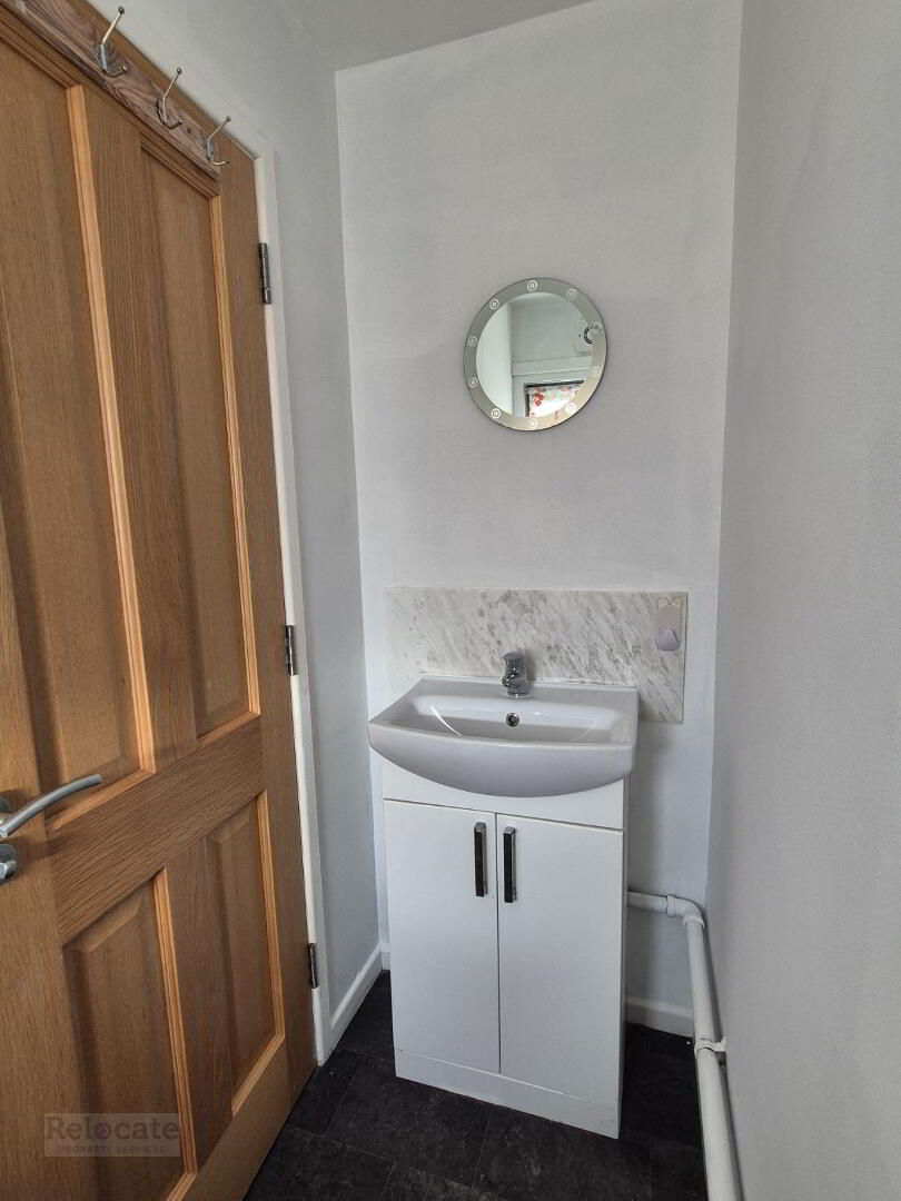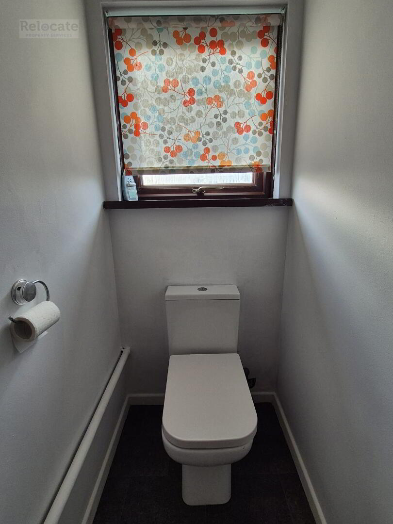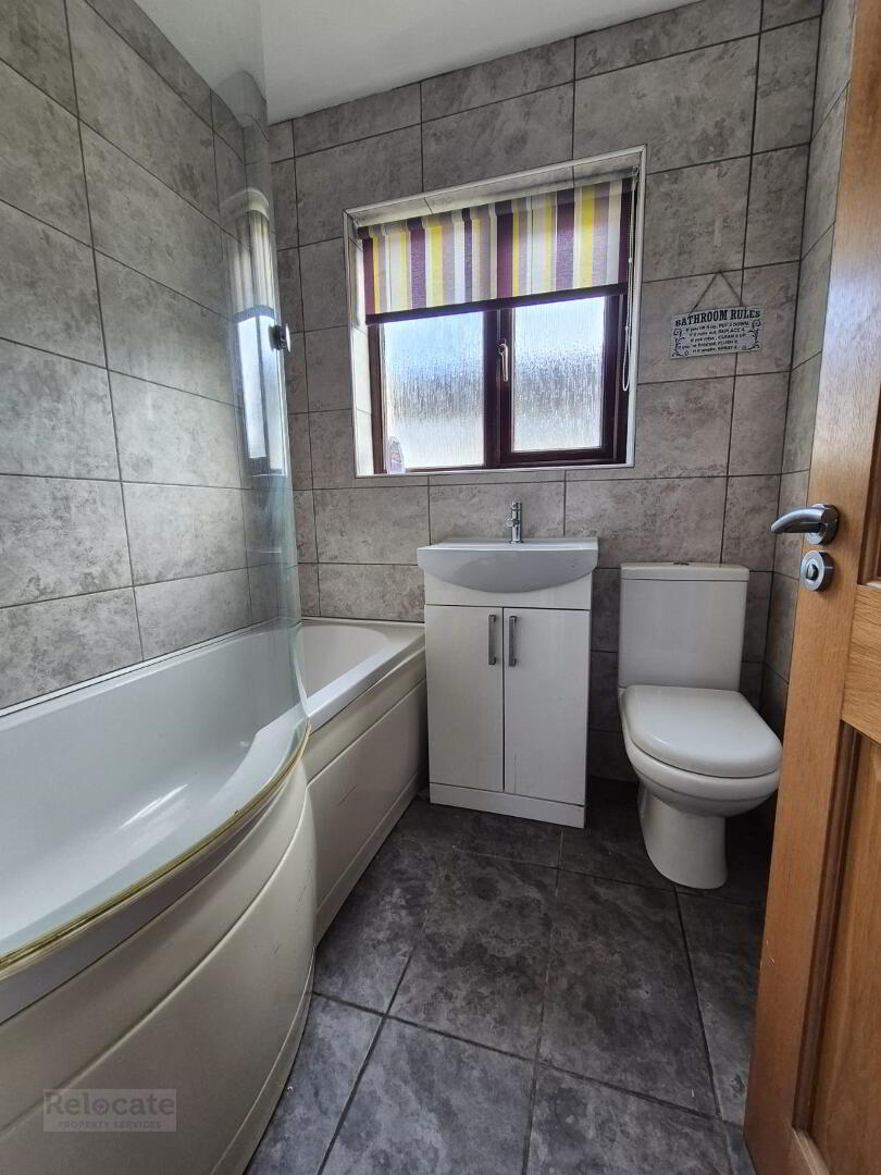 Fitted suite comprising WC, wash hand basin and curved bath fitted with Mira electric shower. Curved shower screen. Fitted storage unit under sink. Fully tiled walls. Tiled flooring. Extractor fan. Privacy window to rear.