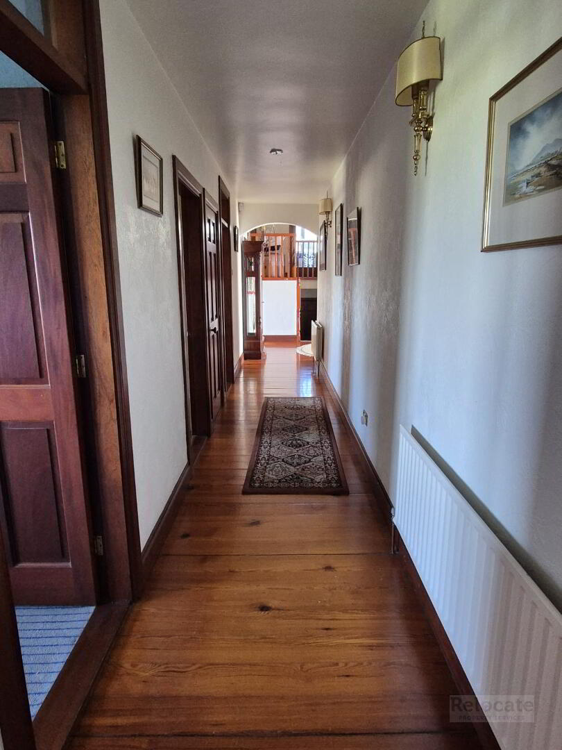 Tiled steps up to front door. Solid wood double doors to entrance. Tiled porch area with vaulted tongue & groove ceiling and spotlights. Solid wood glazed door with glazed side panels through to hall.