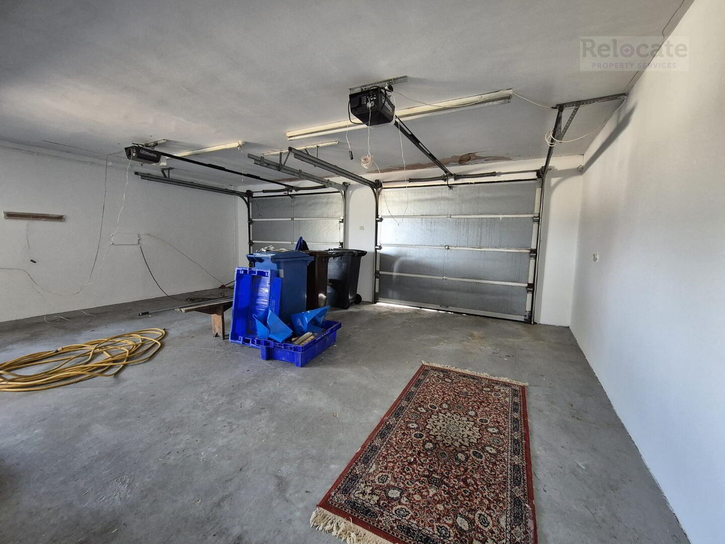 2 automatic garage doors. Side windows. 3 double power sockets. Door through to back hall/boiler area.