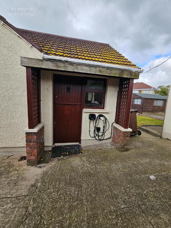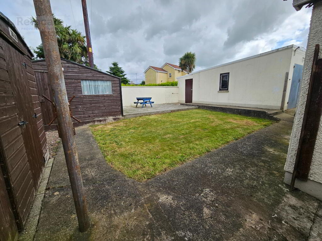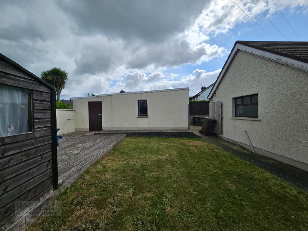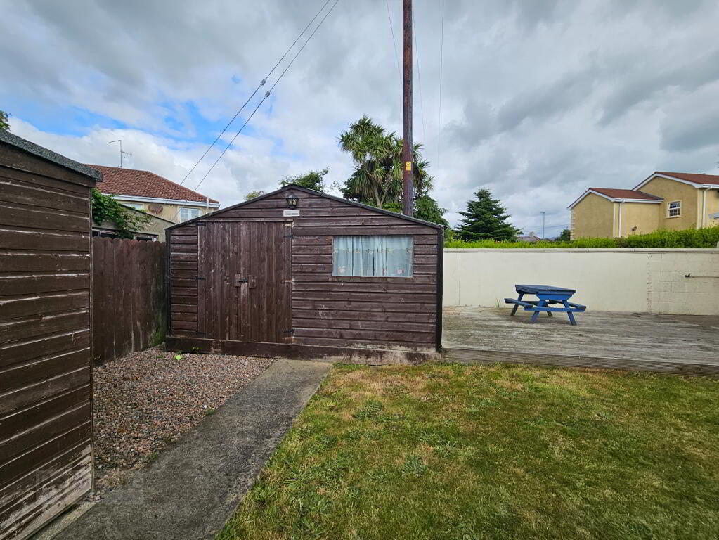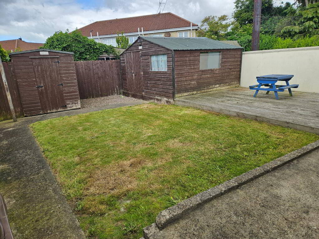 To the front and side there is a tarmac drive with off street parking. A boundary wall and wooden gate to the front, enclosing the property. To the rear there is a lawn, raised decking, large outbuilding and two wooden sheds.