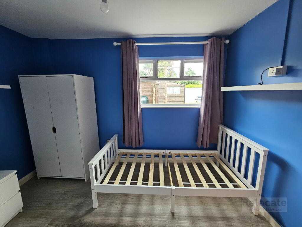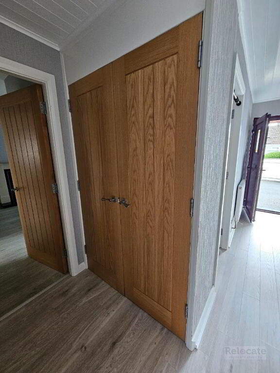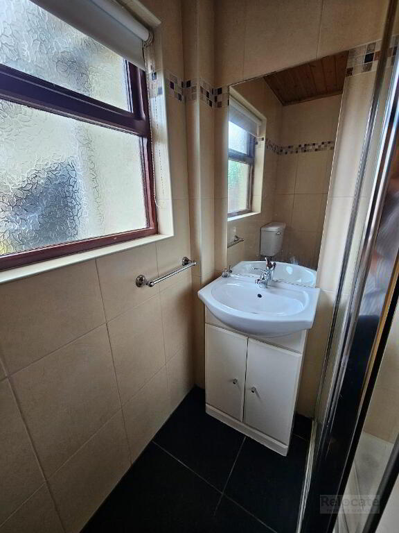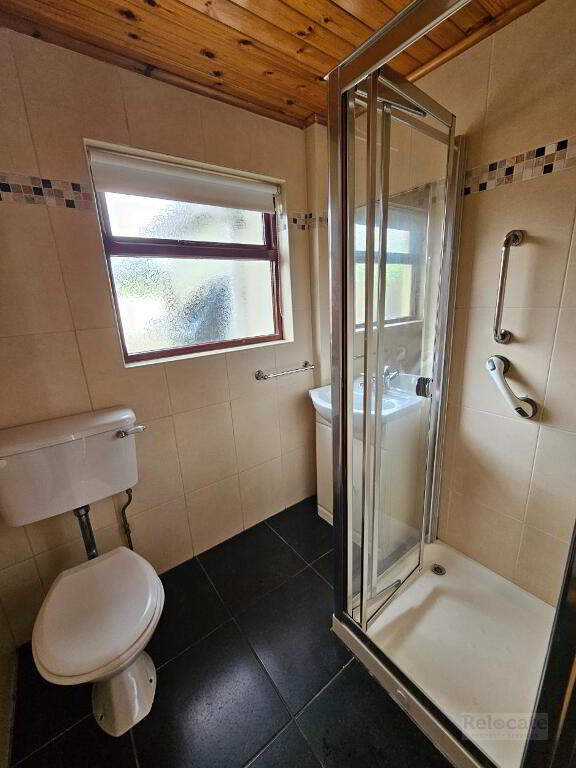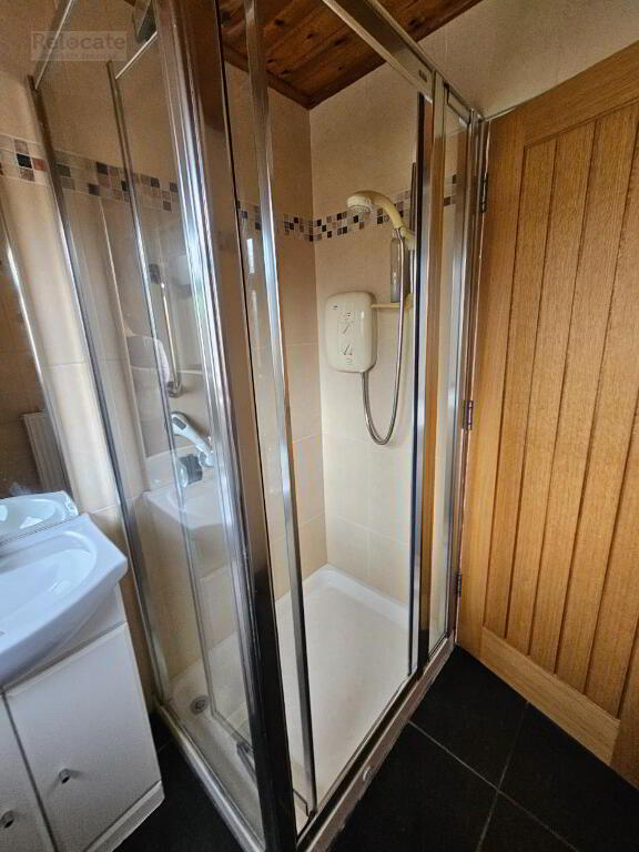 White suite comprising w.c, wash hand basin with vanity unit under and shower cubicle with Mira electric shower. Fully tiled wall and floor. Tongue and groove ceiling. Privacy window to the rear.