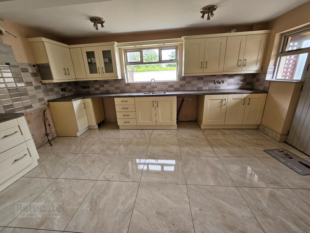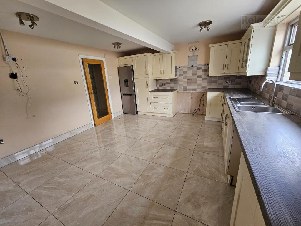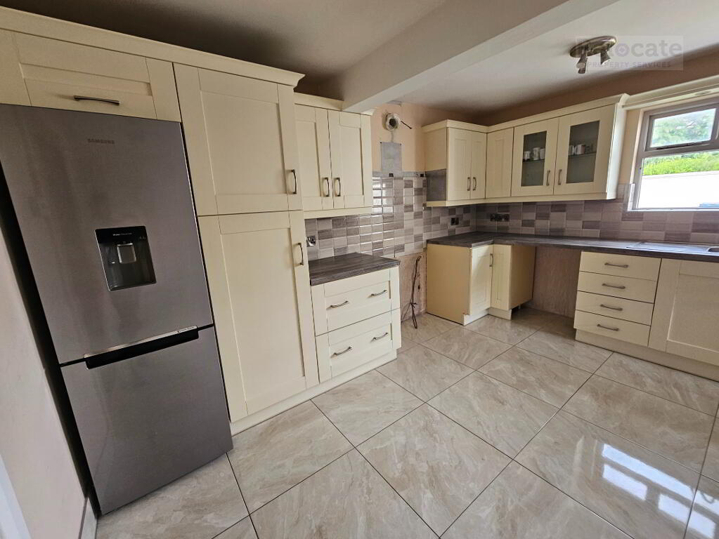 Extended kitchen with high and low level cream fitted units. Stainless steel sink and drainer. Plumbed for washing machine and dishwasher. Recess for range cooker. Recess for fridge/freezer. Window to the side and rear. Half wooden door to the side of the property. Tiled floor and tiled at splashback. Glazed door to living room.