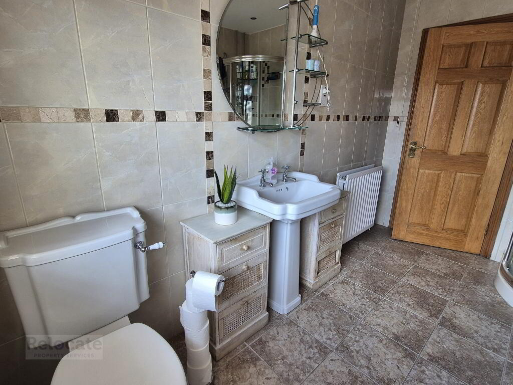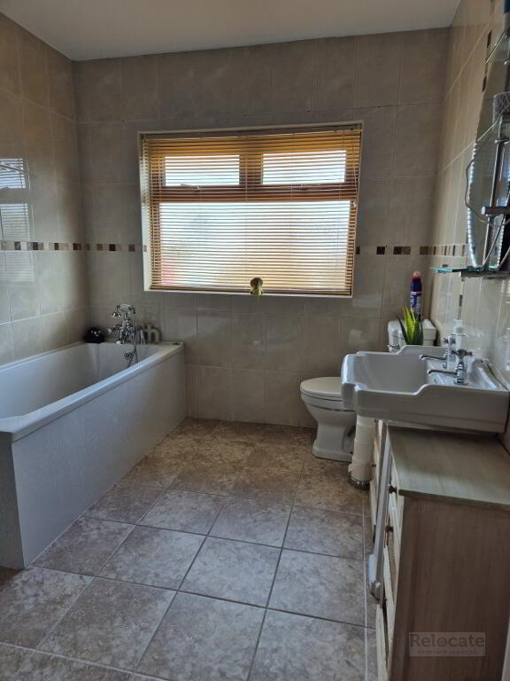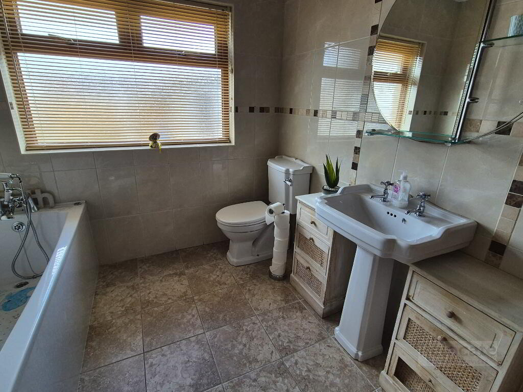 White suite comprising; wc, wash hand basin, bath and large thermostatic shower. Fully tiled. Rear window. Shaver point.