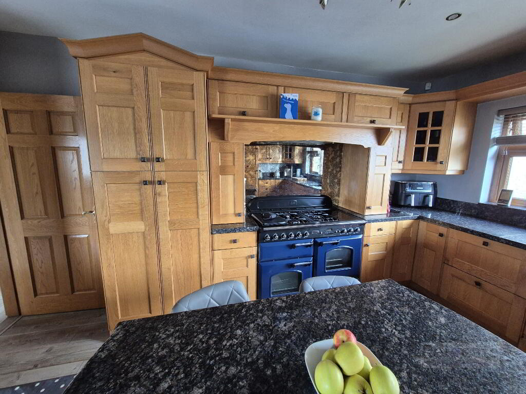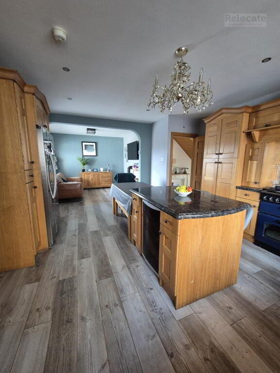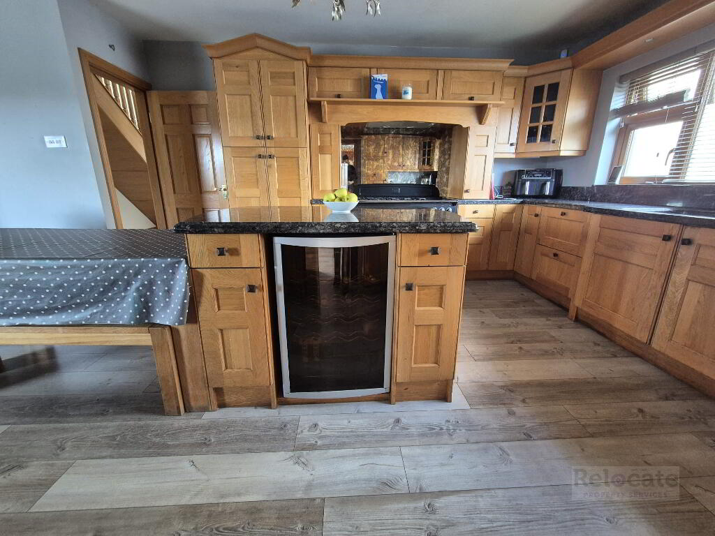 Laminate wooden floor. Solid oak kitchen with high- and low-level units and granite worktops. Side window. Middle island with built in wine cooler. Stainless Middle Island American Fridge/Freezer. Rangemaster oven with mirrored splashback. Arch through to living area. Window to rear overlooking garden. Spotlights. 6 double power sockets. 2 double radiators.
