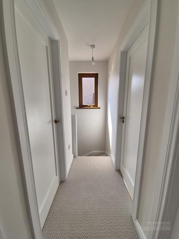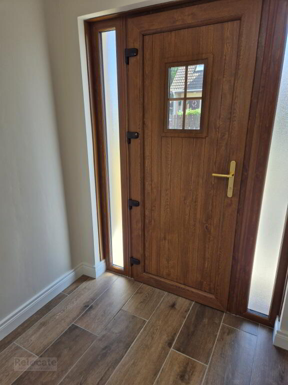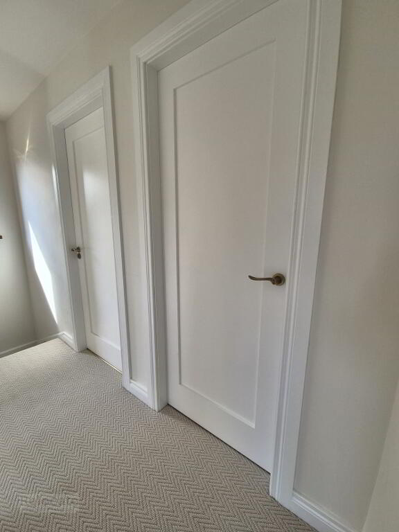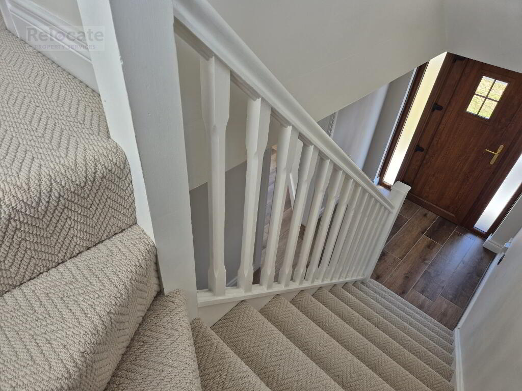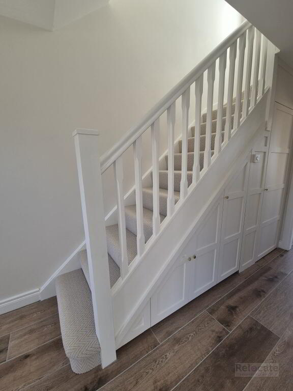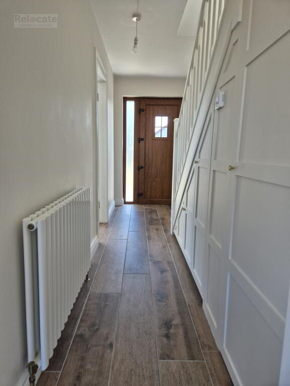 Through new oak pvc front door with privacy glazed side panels. New wood effect tiled floor. WIFI/phone point. Single power point. White painted staircase with new luxury carpet. New built in understairs storage with shelving and pull-out drawer. Access to hotpress with new pressurised system, including new water tank. New designer radiator with brass fittings. Thermostat control. Smoke alarm.