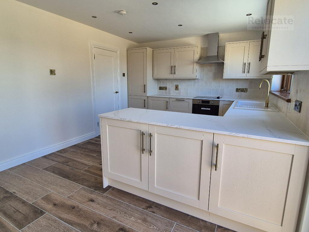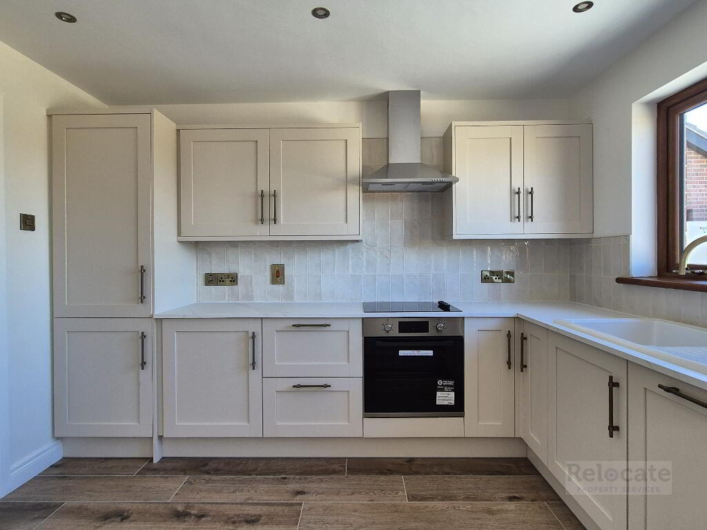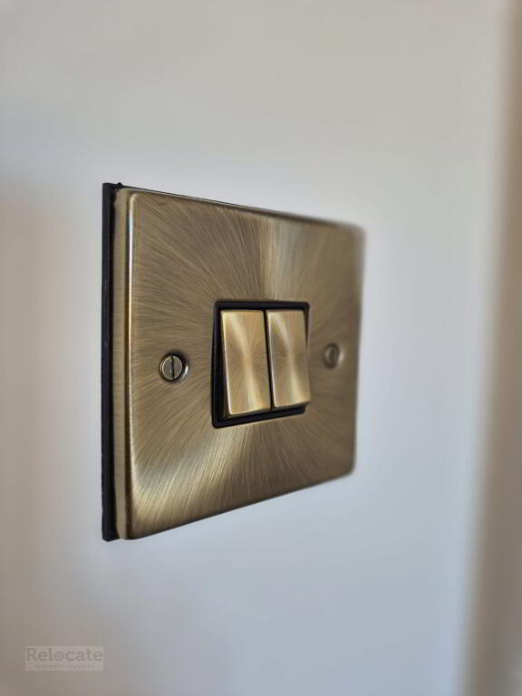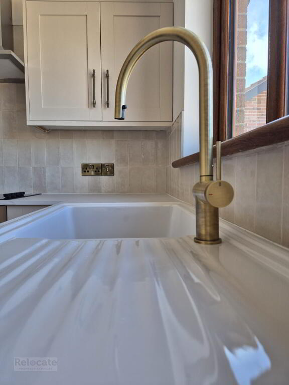 Wood effect tiled flooring to match the rest of downstairs. Newly fitted kitchen in colour ‘stone’ with marble effect worktops. Tiled splashback. Ceramic sink & drainer with brass tap. New appliances to include oven & 4 ring hob. Integrated dishwasher. Recess for integrated fridge/freezer. Brass spotlights. Stainless steel extractor fan. Rear window and external double doors to rear paved garden. 3 double & 1 single brass power sockets. Smoke alarm. Designer radiator.