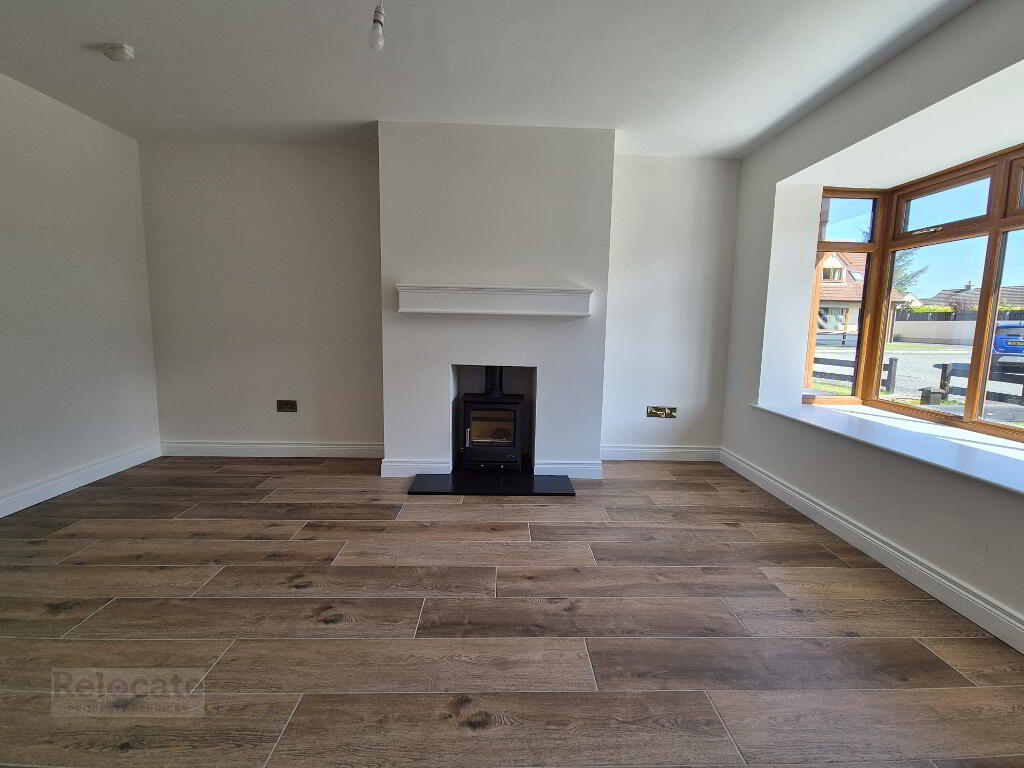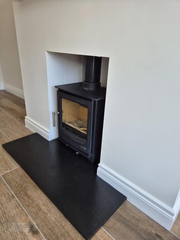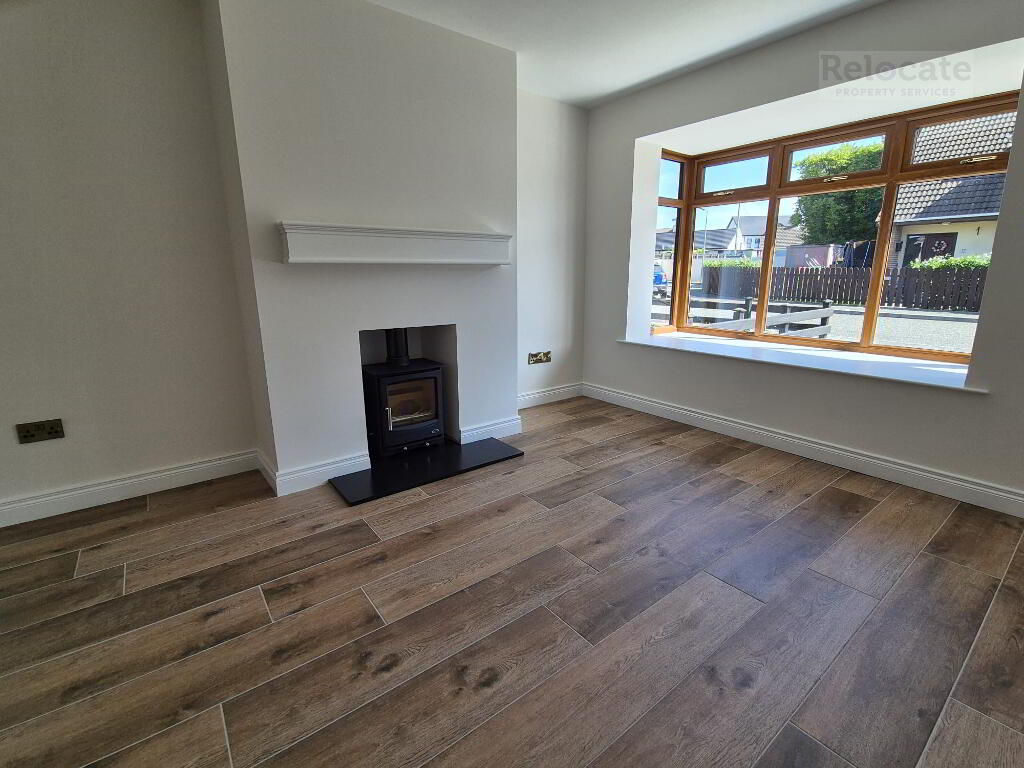 New tiled effect flooring to match hall floor. New front bay window allowing for plenty of natural light. 3 double power sockets & TV point. New Mazona wood burning stove with black hearth and white wood mantle. Smoke and carbon detectors.