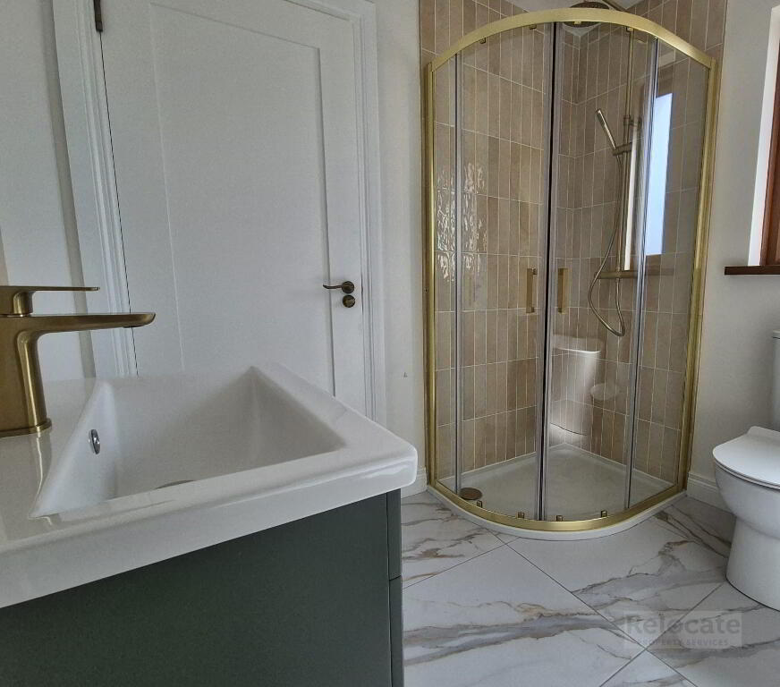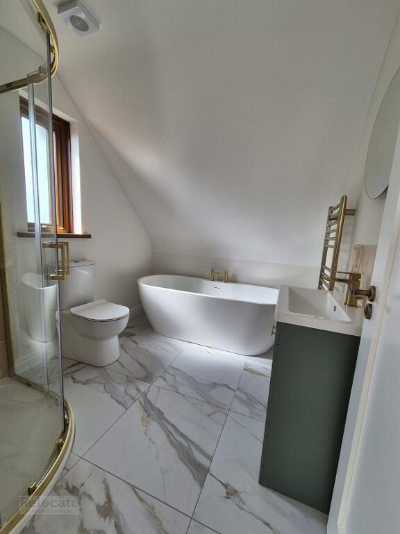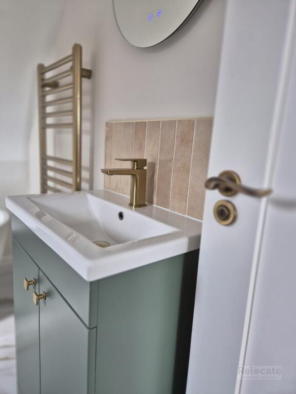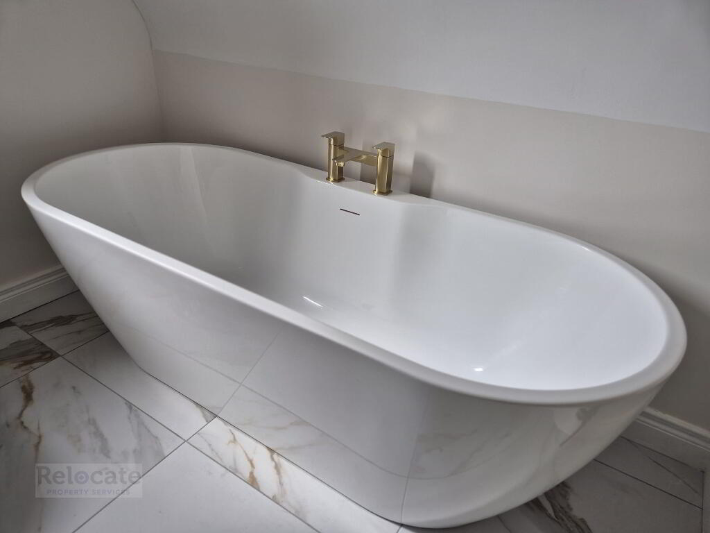 New freestanding bath, wc and wash hand basin with modern vanity unit. New wall mirror with heat/light touch screen. New thermostatic brass shower with rain head and handheld combo. New marble effect tiled flooring and tiled at splashbacks. New brass towel heater. Privacy window.