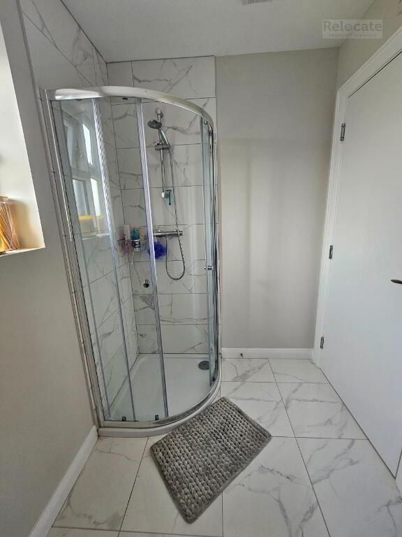 White suite comprising w.c, wash hand basin and shower cubicle with thermostatic shower. Extractor fan. Tiled floor and tiled at splashback. Privacy window to the side. Heated towel rail.