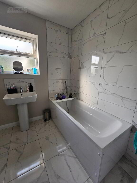 White suite comprising w.c, wash hand basin and bath. Shower cubicle with thermostatic shower. Extractor fan. Heated towel rail. Tiled floor and tiled splashback. Privacy window to the side.