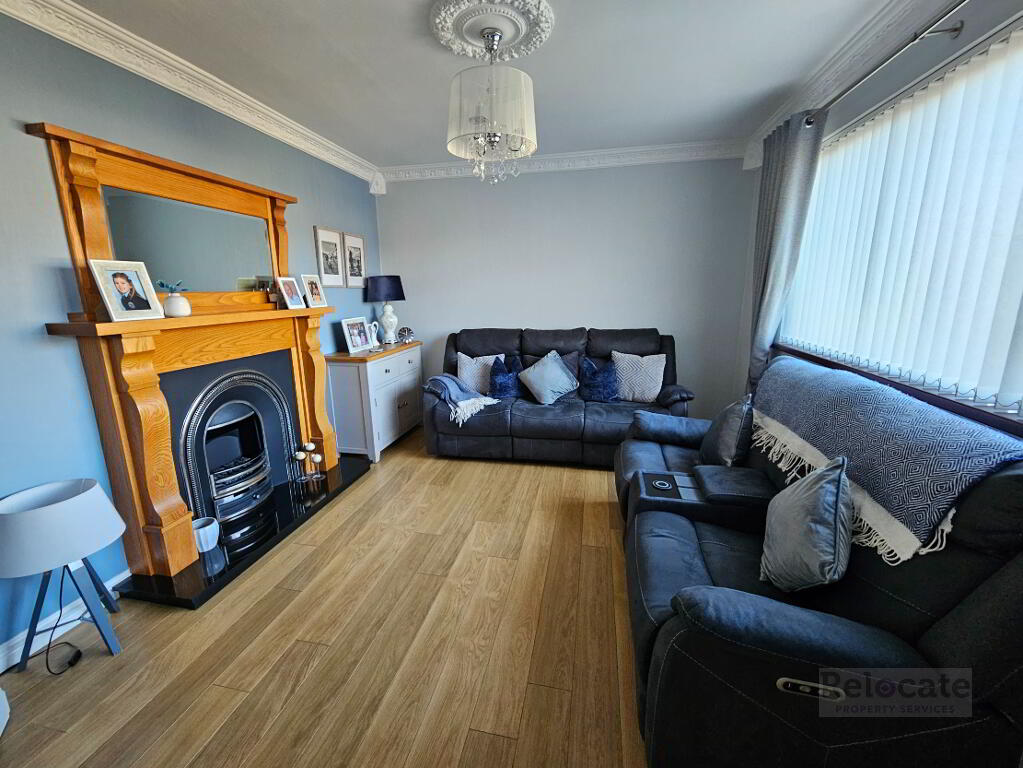 Laminate wooden floor underneath. Ceiling rose and coving. Front window. Electric fire with oak surround and granite hearth.