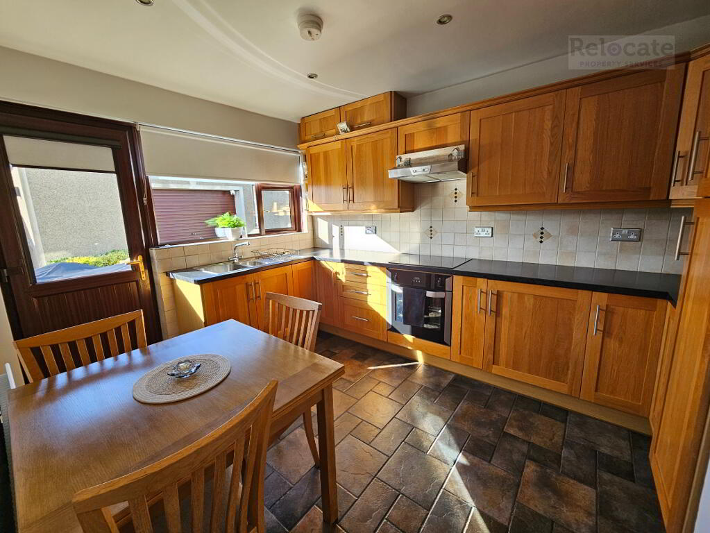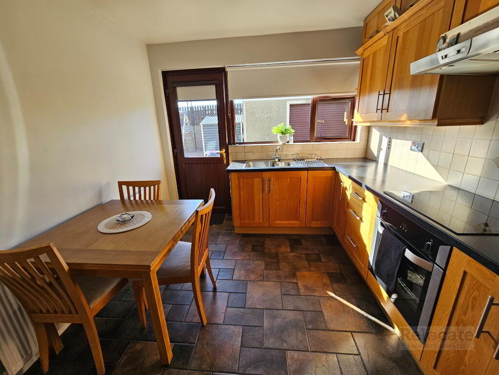 Oak fitted kitchen with high and low level units. Stainless steel sink and drainer. Tiled at splash back. 'Belling' electric oven and hob with extractor fan over. Integrated Fridge. Tiled floor. Window to rear. Glazed PVC external door.