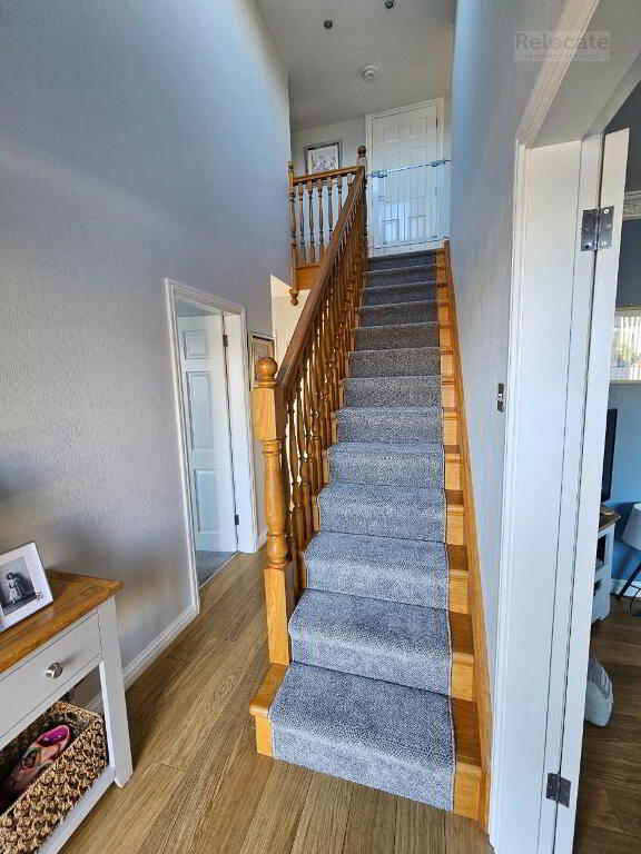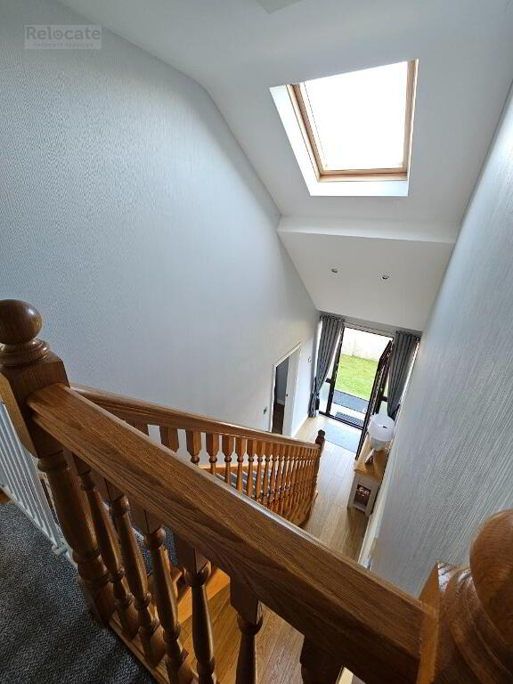 Oak stairs to first floor fitted with carpet runner. Carpet on floor landing. Spot lighting. Roof light on stairs ceiling.