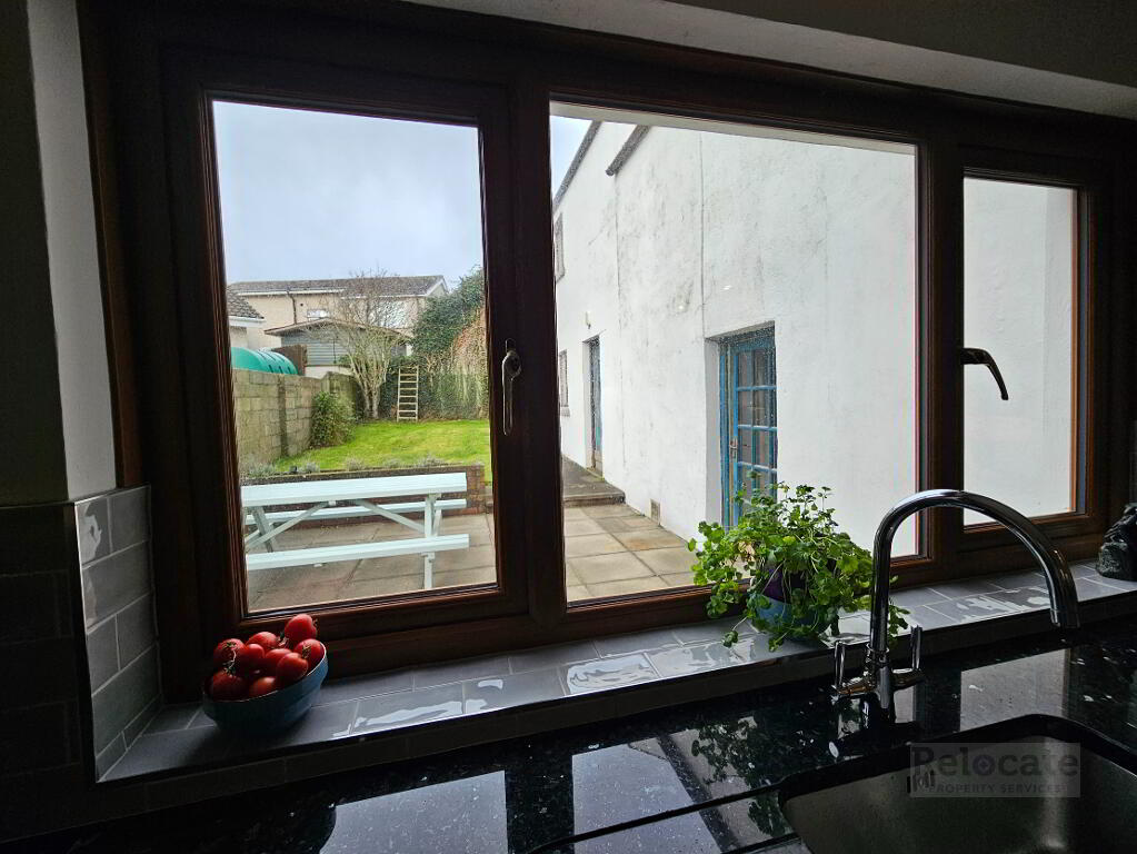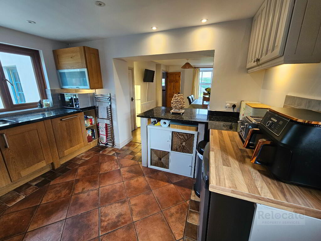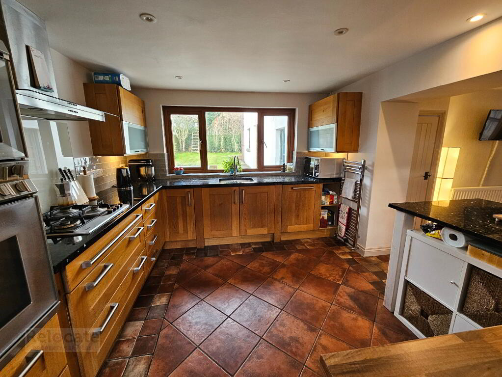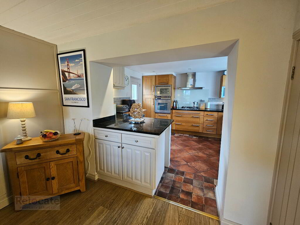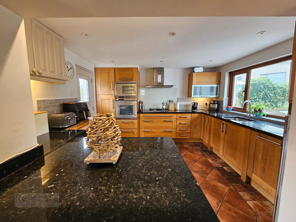 Oak fitted kitchen with black granite worktop. Breakfast bar. Stainless steel sink. Gas hob and extractor fan over. Oven and steam oven. Large window to the rear. Spot lighting. Heated towel rail. Hardwood door to the rear. Tiled at splashback. Tiled floor.