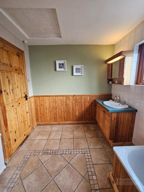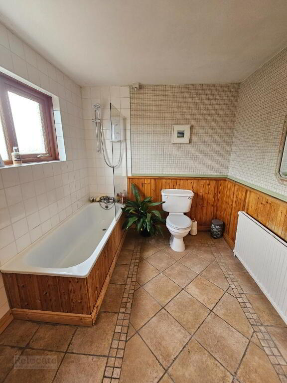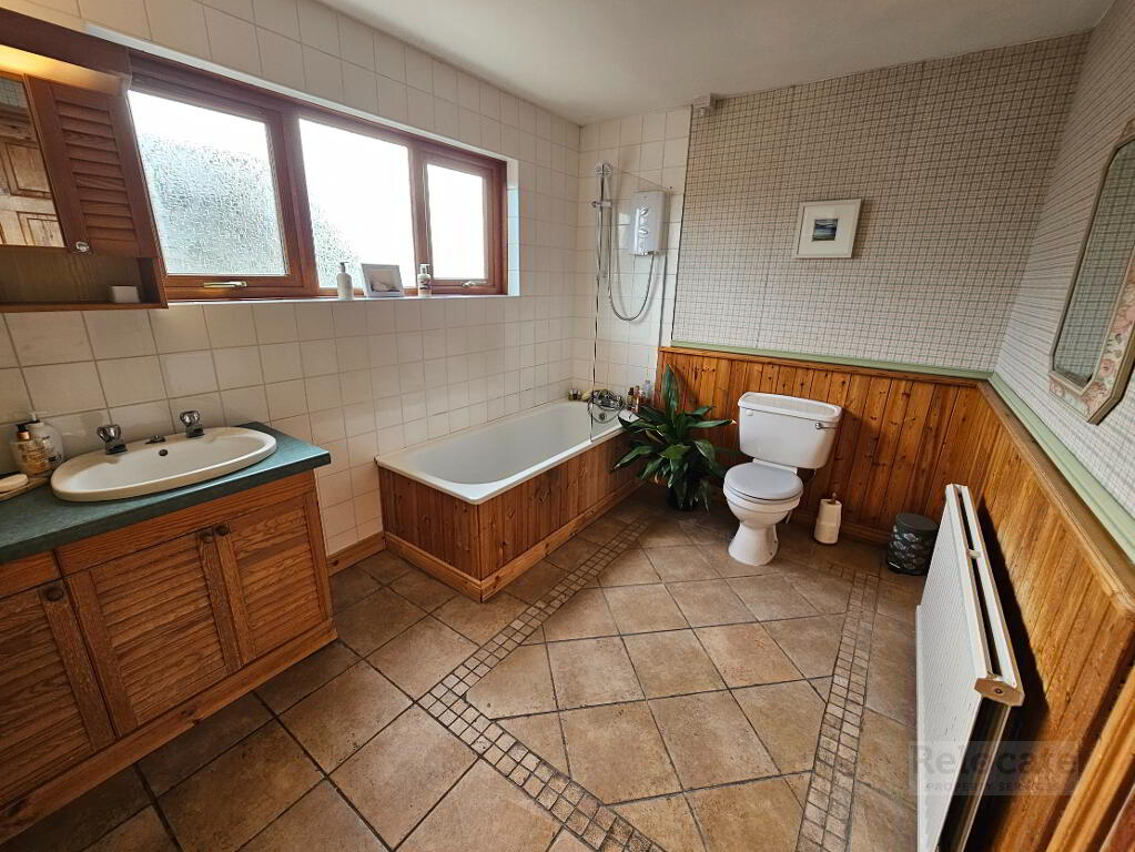 White suite comprising w.c, wash hand basin with wooden unit under. Bath with wood panelling. Shower over bath and shower screen. Tiled feature wall and splashback. Privacy window to the rear. Access to roofspace.
