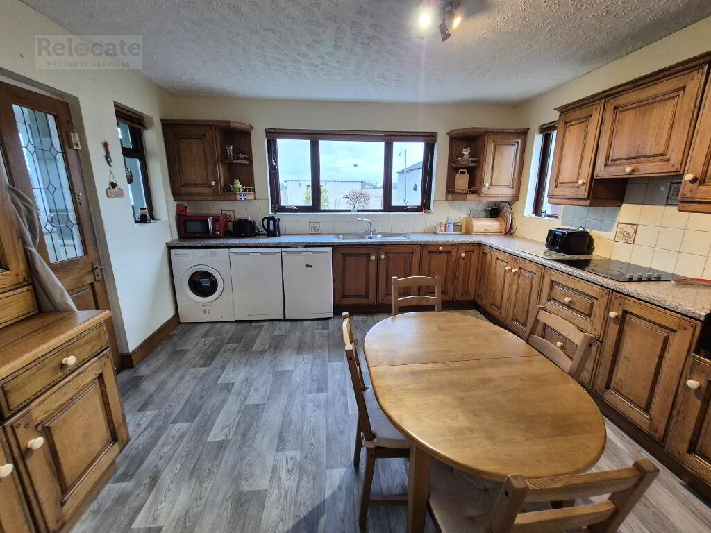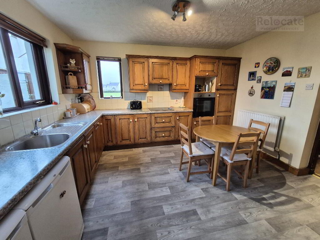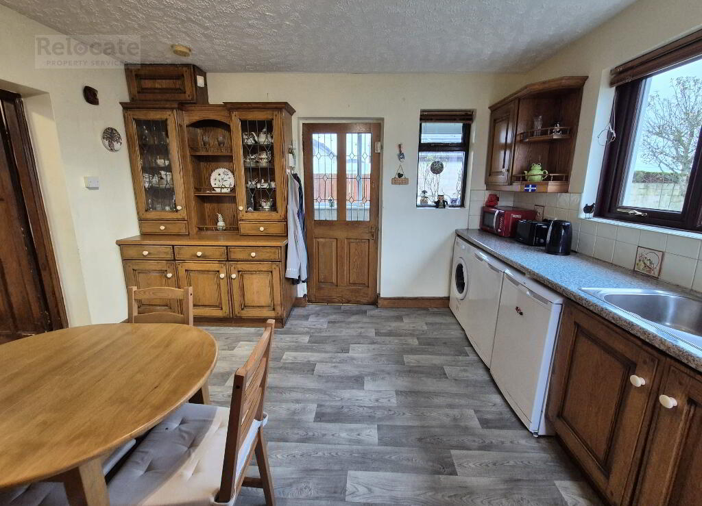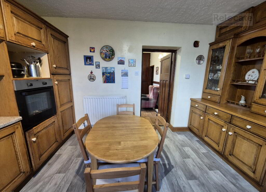 Solid kitchen with good range of high and low level units. Matching dresser with display cabinets and lighting. Stainless steel sink & drainer. Tiled splashback. Electric 4 ring hob. Integrated electric oven. Wood effect vinyl flooring. Undercounter area for fridge/freezer. Plumbed for washing machine. Double radiator. Window to either side. Rear aspect window overlooking garden. Solid oak glazed door through to back porch.