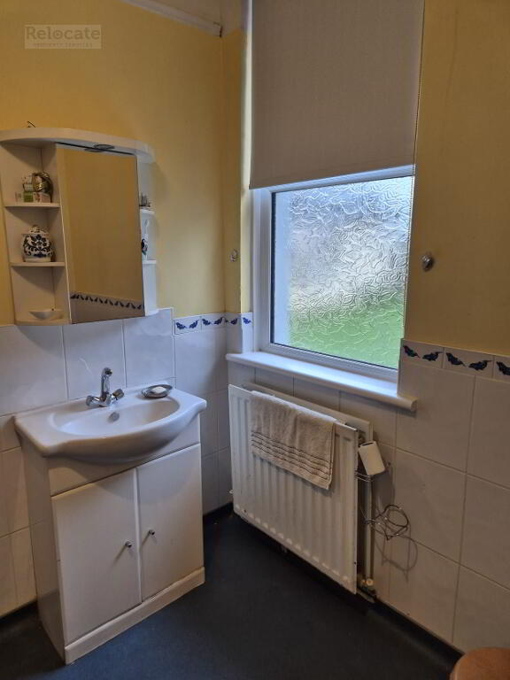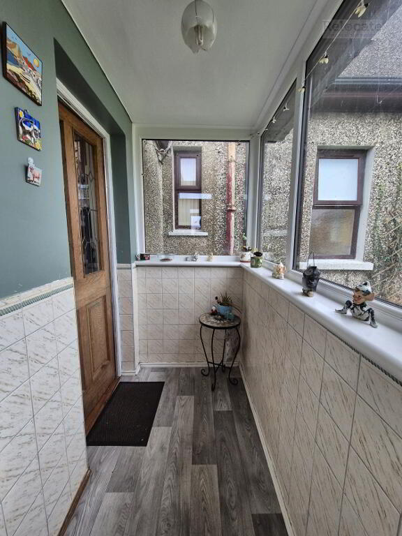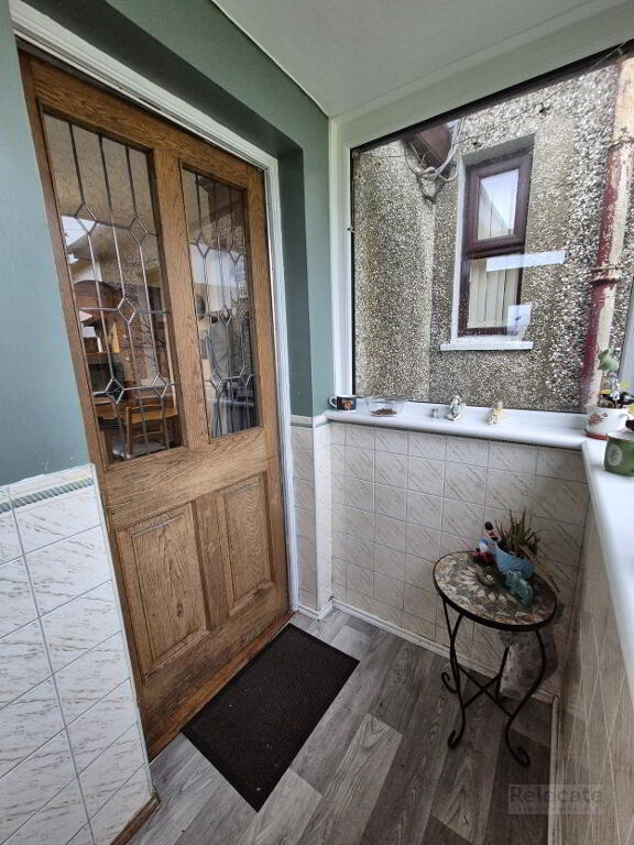 Vinyl flooring. Tiled walls. PVC Glazing surround and windowsill. Rear external pvc door with light panel over.